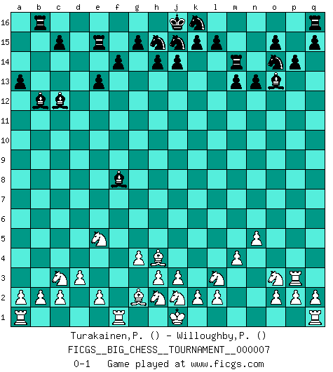 Last move : 0-1 2007 August 15 9:38:48 [Event "FICGS__BIG_CHESS__TOURNAMENT__000007"] [Site "FICGS"] [Date "2007.05.17"] [Round "1"] [White "Turakainen,Pekka I."] [Black "Willoughby,Peter"] [Result "0-1"] [WhiteElo ""] [BlackElo ""] 1.n2-n4 j15-k13 2.m2-m4 d15-d13 3.m1-m3 e15-e13 4.m3-l3 p16-o14 5.g2-g4 n15-n13 6.h1-d5 f16-b12 7.l3-k3 m15-m13 8.d5-d13 e16-e15 9.l1-p5 f15-f14 10.b1-c3 b16-c14 11.o1-f9 c16-e14 12.d13-j8 h16-p9 13.f9-k13 p9-p5 14.n4-n5 g16-j15 15.k13-g10 p15-p14 16.g10-c14 b15-c14 17.j8-c14 a16-c16 18.k3-p3 p5-m8 19.p1-o3 m8-f2 20.g1-f3 f2-l7 21.k1-l3 l16-o13 22.d2-d3 a15-a13 23.c1-g5 c16-b16 24.g5-h4 l7-f12 25.f1-g2 o16-f8 26.e1-f1 f12-c12 27.c14-c12 e14-c12 28.f3-e5 m16-m14 0-1 This big chess game has been lost on time (started : 2007.05.17 21:10:36) Follow this game move after move (download)Do you realize Fischer almost never has any bad pieces? He exchanges them, and the bad pieces remain with his opponents. (Yuri Balashov) Wenn Spassky eine Figur opfert kannst du genauso gut aufgeben. Aber wenn Tal eine Figur opfert, spiel weiter. Er könnte noch eine weitere opfern, und dann ... wer weiß? (Miguel Najdorf) Nunca antes ha habido un jugador de Ajedrez con tal conocimiento a fondo de las complejidades del juego y una inmensa voluntad absolutamente indomable de ganar. Yo pienso que Fischer es el jugador mas grande que jamás haya existido. (Lisa Lane) Même un GMI sait rarement calculer sur plus de cinq coups une attaque à sacrifices. (Rudolf Spielmann) Wipe them out. All of them. (Darth Sidious in Star Wars ep.1)