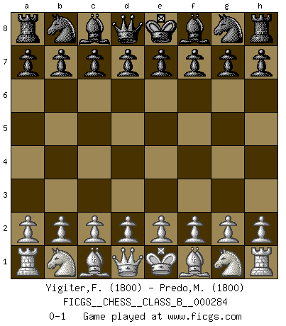 Last move : 0-1 2018 October 10 7:26:11 [Event "FICGS__CHESS__CLASS_B__000284"] [Site "FICGS"] [Date "2018.08.31"] [Round "1"] [White "Yigiter,Fatih"] [Black "Predo,Mart Vincent"] [Result "0-1"] [WhiteElo "1800"] [BlackElo "1800"] 0-1 This chess game has been lost on time (started : 2018.08.31 0:59:14) Player Black won this chess game. Follow this game move after move (download)No Chess Grandmaster is normal; they only differ in the extent of their madness. (Viktor Korchnoi) Den Ruhm habe ich schon, jetzt brauche ich noch das Geld. (Wilhelm Steinitz) El Ajedrez es realmente noventa y nueve por ciento calculación. (Soltis) La vérité est comme le meilleur coup aux échecs : elle existe, mais il faut la chercher. (Arturo Perez-Reverte) Whatever you do, don't be bored. This is absolutely the most exciting time we could have possibly hoped to be alive. And things are just starting. (From movie Waking life)