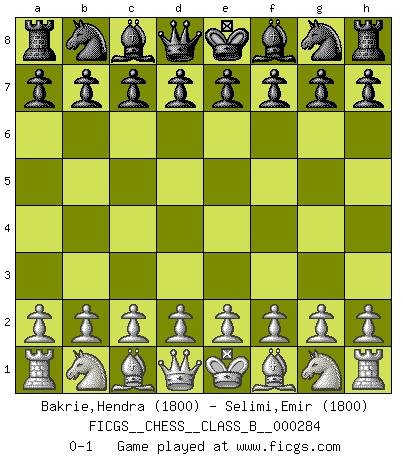 Last move : 0-1 2018 October 10 7:26:11 [Event "FICGS__CHESS__CLASS_B__000284"] [Site "FICGS"] [Date "2018.08.31"] [Round "1"] [White "Bakrie,Hendra"] [Black "Selimi,Emir"] [Result "0-1"] [WhiteElo "1800"] [BlackElo "1800"] 0-1 This chess game has been lost on time (started : 2018.08.31 0:59:14) Player Black won this chess game. Follow this game move after move (download)All that matters on the Chessboard is good moves. (Bobby Fischer) Ich trinke, ich rauche, ich spiele, ich liebe Frauen aber Fernschach ist ein Laster, das ich nicht habe. (Mikhail Nekhemyevich Tal) Si un gobernante no entiende al Ajedrez, ¿como puede governar él un reinado?. (El Rey Khusros II) Aux échecs, les retours au sommet sont rares : les dommages psychologiques consécutifs à une défaite sont trop sévères. (Daily Telegraph) The existence of forgetting has never been proved: We only know that some things don't come to mind when we want them. (Friedrich Nietzsche)