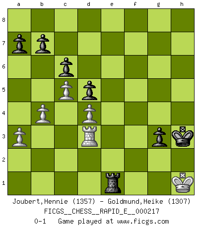 Last move : 0-1 2018 November 6 18:0:58 [Event "FICGS__CHESS__RAPID_E__000217"] [Site "FICGS"] [Date "2018.09.01"] [Round "1"] [White "Joubert,Hennie"] [Black "Goldmund,Heike"] [Result "0-1"] [WhiteElo "1357"] [BlackElo "1307"] 1.e4 d5 2.exd5 Qxd5 3.Nc3 Qa5 4.d4 Nf6 5.Nf3 Bf5 6.Be2 e6 7.O-O c6 8.Bd2 Nbd7 9.Ne4 Bb4 10.Nxf6+ Nxf6 11.c3 Bd6 12.c4 Qc7 13.c5 Bf4 14.Bxf4 Qxf4 15.Qd2 Qxd2 16.Nxd2 O-O-O 17.Nf3 Rhe8 18.Rfd1 Nd5 19.Bc4 Be4 20.Ne5 f6 21.Ng4 Nb4 22.f3 Bf5 23.Rac1 h5 24.Ne3 Bh7 25.a3 Nd5 26.Nxd5 exd5 27.Bd3 Bxd3 28.Rxd3 Re2 29.b4 Rde8 30.Kf1 R8e3 31.R1c3 Re1+ 32.Kf2 R3e2+ 33.Kg3 Rf1 34.Re3 Rfe1 35.Rxe2 Rxe2 36.Rd3 Kd7 37.h4 g5 38.hxg5 fxg5 39.Kh3 Ke6 40.g3 Kf5 41.g4+ hxg4+ 42.fxg4+ Kf4 43.Rd1 Re3+ 44.Kh2 Kxg4 45.Kg2 Re2+ 46.Kg1 Kh3 47.Rd3+ Kh4 48.Kf1 Re4 49.Kf2 g4 50.Kg2 Re2+ 51.Kh1 g3 52.Kg1 Kh3 53.Rd1 Kg4 54.Kh1 Rh2+ 55.Kg1 Kh3 56.Rd3 Re2 57.Kh1 Re1+ 0-1 Scandinavian defense Kingside Castling by player White (move 7) Queenside Castling by player Black (move 16) Player Black won this chess game. Follow this game move after move (download)I'm not afraid of Spassky. The world knows I'm the best. You don't need a match to prove it. (Bobby Fischer) Der Verteidiger gebe der Gewalt nach, aber nur der Gewalt. Er schaffe sich nicht freiwillig, etwa aus Blindheit oder aus Schrecken, irgendwelche Schwächen. Er lasse sich nicht bluffen. (Emanuel Lasker) Bobby Fischer es el jugador de Ajedrez mas grande que jamás haya existido. (Ken Smith) Il n'y a pas de prix trop élevé au scalp de l'ennemi. (Koblentz) All art requires courage. (Anne Tucker)