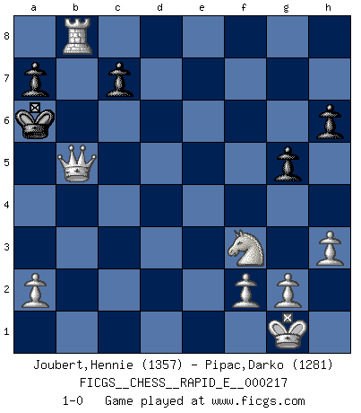 Last move : 1-0 2018 October 10 8:39:52 [Event "FICGS__CHESS__RAPID_E__000217"] [Site "FICGS"] [Date "2018.09.01"] [Round "1"] [White "Joubert,Hennie"] [Black "Pipac,Darko"] [Result "1-0"] [WhiteElo "1357"] [BlackElo "1281"] 1.e4 e5 2.Nf3 Nc6 3.Bc4 h6 4.d4 exd4 5.c3 dxc3 6.Qb3 Qf6 7.Nxc3 Bb4 8.Bd2 d6 9.O-O Nge7 10.Nd5 Nxd5 11.exd5 Bxd2 12.dxc6 Ba5 13.cxb7 Rb8 14.bxc8Q+ Rxc8 15.Qa4+ Kd8 16.Qxa5 Qxb2 17.Bxf7 Rf8 18.Bb3 Qf6 19.Rfe1 Rb8 20.Rad1 Qf4 21.Rd4 Qf6 22.Red1 Qg6 23.Rxd6+ Qxd6 24.Rxd6+ Kc8 25.Qa6+ Rb7 26.Rd4 Rf6 27.Qe2 Rf8 28.Bd5 Rb6 29.h3 Rd8 30.Be6+ Kb7 31.Rxd8 Rxe6 32.Qxe6 g5 33.Qd5+ Kb6 34.Rb8+ Ka6 35.Qb5+ 1-0 King's pawn game Kingside Castling by player White (move 9) Promotion Queen by player White (move 14) Player White won this chess game. Follow this game move after move (download)Only the player with the initiative has the right to attack. (Wilhelm Steinitz) Der Bart als Geschlechtszeichen mitten im Gesicht ist obszön. Daher gefällt er den Weibern. [Zugegeben, kein Schachzitat, aber unglaublich originell] (Arthur Schopenhauer) El Ajedrez es la vida. (Bobby Fischer) Même un GMI sait rarement calculer sur plus de cinq coups une attaque à sacrifices. (Rudolf Spielmann) I feel so... helpless. (C-3PO in Star Wars ep.3)