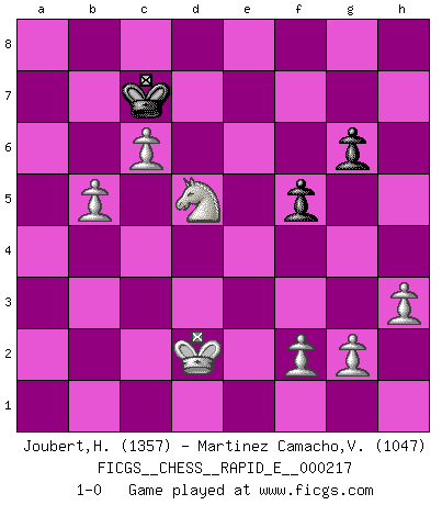 Last move : 1-0 2018 November 9 14:26:25 [Event "FICGS__CHESS__RAPID_E__000217"] [Site "FICGS"] [Date "2018.09.01"] [Round "1"] [White "Joubert,Hennie"] [Black "Martinez Camacho,Victor Hugo"] [Result "1-0"] [WhiteElo "1357"] [BlackElo "1047"] 1.e4 c6 2.d4 d5 3.Nd2 dxe4 4.Nxe4 Bf5 5.Ng3 Bg6 6.Nf3 e6 7.Ne5 Nd7 8.Nxg6 hxg6 9.h3 Ngf6 10.Bd3 Be7 11.O-O O-O 12.Bg5 Nh7 13.Bxe7 Qxe7 14.Qe2 Rfe8 15.c3 e5 16.dxe5 Qxe5 17.Qxe5 Nxe5 18.Bc2 Rad8 19.Rad1 Rxd1 20.Rxd1 Nf6 21.Kf1 Nd5 22.Ne4 f5 23.Nd6 Re7 24.Bb3 b5 25.Bxd5+ cxd5 26.Nxb5 Rb7 27.Rxd5 Nc4 28.b3 Nb6 29.Re5 Kf7 30.Nd6+ Kf6 31.Rxf5+ gxf5 32.Nxb7 Nd5 33.c4 Nb4 34.a3 Nc2 35.a4 Nd4 36.b4 Ke6 37.c5 Kd5 38.Na5 Nc2 39.c6 Kd6 40.b5 Nb4 41.Ke2 a6 42.Nc4+ Kc7 43.Ne3 g6 44.Kd2 axb5 45.axb5 Nd5 46.Nxd5+ 1-0 Caro-Kann : 3.Nd2 Kingside Castling by player White (move 11) Kingside Castling by player Black (move 11) 10 pieces endgame at move 46 : White KNPPPPP , Black KPP WHITE : King + 1 Knight 5 Pawns BLACK : King + 2 Pawns Player White won this chess game. Follow this game move after move (download)In Fischer's hands, a slight theoretical advantage is as good a being a Queen ahead. (Isaac Kashdan) Irgendwie scheint mir sonntags früh um 9 Uhr der Killerinstinkt verloren gegangen zu sein. (Alexej Shirov) La esencia del Ajedrez es pensar acerca de lo que el Ajedrez es. (David Bronstein) Même si l'adversaire joue le coup analysé précédemment, recommencez l'analyse en voyant la nouvelle position. Première règle de Blumenfeld The beginning of wisdom is silence. The second step is listening. (Unknown)