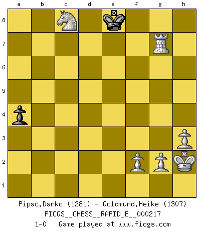 Last move : 1-0 2018 October 16 20:48:19 [Event "FICGS__CHESS__RAPID_E__000217"] [Site "FICGS"] [Date "2018.09.01"] [Round "1"] [White "Pipac,Darko"] [Black "Goldmund,Heike"] [Result "1-0"] [WhiteElo "1281"] [BlackElo "1307"] 1.e4 d5 2.exd5 Qxd5 3.Nc3 Qa5 4.a3 c6 5.h3 Nf6 6.Nf3 Bf5 7.d4 e6 8.Bd2 Qc7 9.Bd3 Bxd3 10.cxd3 Nbd7 11.Qb3 Nb6 12.O-O Nbd5 13.Ne5 Bd6 14.Rac1 Nxc3 15.Bxc3 O-O 16.Rfe1 Nd5 17.Qc4 Nxc3 18.bxc3 f6 19.Ng4 Rfe8 20.Rxe6 Kh8 21.a4 Rxe6 22.Qxe6 Ba3 23.Re1 h6 24.c4 Qd6 25.Qxd6 Bxd6 26.c5 Bc7 27.Re7 Rc8 28.Ne3 Kg8 29.Nf5 g6 30.Nxh6+ Kf8 31.Rf7+ Ke8 32.Rxf6 Rd8 33.Rxg6 Rxd4 34.Rg7 Kd8 35.Nf7+ Kc8 36.a5 Bxa5 37.Nd6+ Kd8 38.Nxb7+ Ke8 39.Nxa5 Rxd3 40.Nxc6 a6 41.Na7 a5 42.c6 Rc3 43.c7 Rc1+ 44.Kh2 a4 45.c8Q+ Rxc8 46.Nxc8 1-0 Scandinavian (centre counter) defense Kingside Castling by player White (move 12) Kingside Castling by player Black (move 15) 10 pieces endgame at move 40 : White KRNPPPP , Black KRP WHITE : King + 1 Rook 1 Knight 4 Pawns BLACK : King + 1 Rook 1 Pawn Promotion Queen by player White (move 45) 9 pieces endgame at move 45 : White KRNPPP , Black KRP WHITE : King + 1 Rook 1 Knight 3 Pawns BLACK : King + 1 Rook 1 Pawn 8 pieces endgame at move 46 : White KRNPPP , Black KP WHITE : King + 1 Rook 1 Knight 3 Pawns BLACK : King + 1 Pawn Player White won this chess game. Follow this game move after move (download)Chess is a terrible game. If you have no center, your opponent has a freer position. If you do have a center, then you really have something to worry about ! (Siegbert Tarrasch) Die Idee von Capablanca, Schach als Fach in den Schulen zu lehren, ist großartig. (Fidel Castro) Todavía soy una víctima del Ajedrez. Tiene toda la belleza del arte y mucho mas. No puede ser comercializado. El Ajedrez es mas puro que el arte en su posición social. (Marcel Duchamp) Il vaut mieux sacrifier les pièces de l'adversaire. (Xavier Tartacover) Do not put your faith in what statistics say until you have carefully considered what they do not say. (William W. Watt)