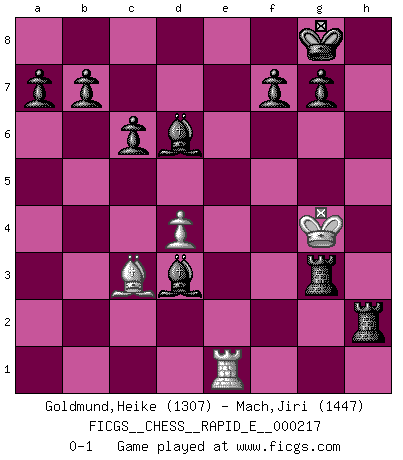 Last move : 0-1 2018 November 29 8:53:26 [Event "FICGS__CHESS__RAPID_E__000217"] [Site "FICGS"] [Date "2018.09.01"] [Round "1"] [White "Goldmund,Heike"] [Black "Mach,Jiri"] [Result "0-1"] [WhiteElo "1307"] [BlackElo "1447"] 1.b4 e5 2.Bb2 Bxb4 3.Bxe5 Nf6 4.c4 Nc6 5.Bb2 O-O 6.a3 Ba5 7.e3 d5 8.cxd5 Qxd5 9.Nf3 Ne4 10.Be2 Nc5 11.Qc2 Bf5 12.Qc1 Nb3 13.Nc3 Qd6 14.Qd1 Nxa1 15.Bxa1 Qxa3 16.O-O Rad8 17.Nb5 Qa2 18.d4 Nb4 19.Nc3 Qc2 20.Qxc2 Bxc2 21.Rc1 c6 22.Na4 Bxa4 23.Ne5 Nd5 24.Nc4 Bb4 25.Nb2 Bb5 26.Nd3 Bd6 27.Kf1 Rfe8 28.g3 Nxe3+ 29.fxe3 Rxe3 30.Kf2 Rde8 31.Re1 Bxd3 32.Bc3 Rxe2+ 33.Kf3 R8e3+ 34.Kg4 h5+ 35.Kxh5 Rxh2+ 36.Kg4 Rxg3+ 0-1 Polish (Sokolsky) opening Kingside Castling by player Black (move 5) Kingside Castling by player White (move 16) Player Black won this chess game. Follow this game move after move (download)Look at Garry Kasparov. After he loses, invariably he wins the next game. He just kills the next guy. That's something that we have to learn to be able to do. (Maurice Ashley) Deine Wertungszahl - vorausgesetzt einige Jahre schachliche Anstrengung - entspricht etwa dem zehnfachen Deines IQ plus 1000. (Jonathan Levitt) Hoy en día, si tu no eres un Gran Maestro a los 14 años, es mejor que lo olvides. (Anand Viswanathan) Horreur, mais aussi harmonie suprême : qu'y avait-il en effet au monde en dehors des échecs ? Le brouillard, l'inconnu, le non-être... (Vladimir Nabokov) A good player is always lucky. (Capablanca)