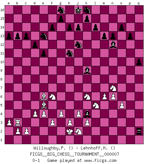Last move : 0-1 2007 September 26 19:10:50 [Event "FICGS__BIG_CHESS__TOURNAMENT__000007"] [Site "FICGS"] [Date "2007.05.17"] [Round "1"] [White "Willoughby,Peter"] [Black "Lehnhoff,Heinz-Georg"] [Result "0-1"] [WhiteElo ""] [BlackElo ""] 1.j2-k4 p16-o14 2.d2-d4 j15-k13 3.e2-e4 e15-e13 4.m2-m4 m15-m13 5.n2-n4 d15-d13 6.p1-o3 n15-n13 7.b1-c3 b16-c14 8.o1-j6 h16-p9 9.o3-q4 o16-j11 10.p2-p3 f16-b12 11.f1-d3 e13-e12 12.l1-o4 c14-e13 13.c1-k8 f15-f14 14.e1-e3 c15-c13 15.e3-g3 h15-g13 16.m1-m3 m16-m14 17.a1-e1 c16-k9 18.o4-m6 j11-n7 19.q4-o5 n7-m6 20.k8-m6 p9-p6 21.h1-m5 l16-o13 22.q2-q4 k9-j8 23.j6-k7 j8-h7 24.l2-l4 o13-l10 25.q4-q5 p6-q7 26.p3-p4 l10-o7 27.m5-l5 m14-l14 28.l5-h5 o7-l4 29.m3-l3 h7-c12 30.k2-k3 l4-e10 31.k7-j6 e10-j6 32.h5-e5 j6-k7 33.q1-n1 q7-p8 34.o2-o3 q16-n16 35.o5-n7 p8-o7 36.e5-o5 o7-o5 37.p4-o5 n16-n14 38.l3-n3 l14-l11 39.n3-l3 n14-l14 40.l3-l11 l14-l11 41.c3-d5 l11-q11 42.n1-q1 e16-e14 43.d3-e2 k7-j8 44.e2-h5 e14-a14 45.a2-a3 a14-a6 46.m6-l5 o14-n12 47.h5-d9 a6-q6 48.q1-p1 q11-p11 49.p1-p6 q6-q5 50.l5-k6 p11-p6 51.n7-p6 q5-q2 52.m4-m5 a16-e16 53.g1-j2 e16-e14 54.d9-f7 l15-l14 55.f7-j10 e14-b14 56.g3-b3 d13-d12 57.k6-l7 q2-q3 58.k1-m2 q3-q1 59.h2-k1 n12-l11 60.j10-e6 b14-a14 61.j1-h2 a14-a7 62.m5-m6 b15-b13 63.f2-f3 l11-m9 64.l7-f12 e12-e11 65.e1-g1 k13-l11 66.k1-l3 q1-g1 67.h2-g1 l11-j12 68.f12-j9 o15-o14 69.g2-g4 a15-a13 70.m2-l4 g13-h11 71.j9-e5 a7-q7 72.l3-j4 q15-q13 73.l4-k6 j8-n12 74.g1-g2 q13-q12 75.o3-o4 p15-p13 76.d5-f6 c12-d13 77.n4-n5 d13-n4 78.k4-m5 n4-o5 79.m5-n7 m9-n7 80.p6-n7 o5-n6 81.j4-l5 n6-k9 82.o4-o5 q7-q2 83.g2-h2 q12-q11 84.j3-j4 q11-q10 85.n5-n6 b12-k4 0-1 Follow this game move after move (download)Fischer is the strongest player in the world. In fact, the strongest player who ever lived. (Larry Evans) Wie bekannt hörte Morphy 1859 auf, Schach zu spielen. Seine Enttäuschung galt nicht so sehr dem Schach, wie den Schachspielern. (Robert James Fischer) El Ajedrez no es como la vida... ¡tiene reglas!. (Mark Pasternak) Je fais ceci parce que dans cinquante coups j'obtiendrai cela; je m'appelle Mikhail Moisevitch Botvinnik. (Botvinnik) Whoever said the pen is mightier than the sword obviously never encountered automatic weapons. (US General Douglas MacArthur)