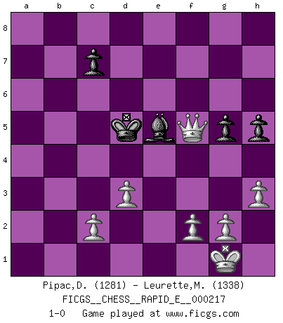 Last move : 1-0 2018 September 18 16:1:49 [Event "FICGS__CHESS__RAPID_E__000217"] [Site "FICGS"] [Date "2018.09.01"] [Round "1"] [White "Pipac,Darko"] [Black "Leurette,Marc-Antoine"] [Result "1-0"] [WhiteElo "1281"] [BlackElo "1338"] 1.e4 e5 2.Nf3 Nc6 3.Bb5 d6 4.Bxc6+ bxc6 5.Nc3 Nf6 6.d3 Bg4 7.h3 Bxf3 8.Qxf3 h6 9.Bd2 Be7 10.a3 O-O 11.Qe3 d5 12.exd5 Nxd5 13.Qxe5 Re8 14.O-O Bd6 15.Qd4 f6 16.Qc4 Qd7 17.Rfe1 Be5 18.a4 Qf7 19.Ra3 Nxc3 20.Qxf7+ Kxf7 21.Bxc3 Bf4 22.Rb3 Bd6 23.Rb7 Rxe1+ 24.Bxe1 c5 25.Ba5 Rc8 26.Rxa7 g5 27.Bc3 Ke6 28.Rb7 f5 29.a5 Kd7 30.a6 Ra8 31.a7 h5 32.b4 cxb4 33.Bxb4 Be5 34.Bc5 Kc6 35.Rb8 Rxb8 36.axb8Q Kxc5 37.Qf8+ Kd5 38.Qxf5 1-0 Ruy Lopez : Old Steinitz defense Kingside Castling by player Black (move 10) Kingside Castling by player White (move 14) Promotion Queen by player White (move 36) Player White won this chess game. Follow this game move after move (download)The passion for playing Chess is one of the most unaccountable in the world. (H.G. Wells) Mein erstes Ziel war nicht, die Partie zu gewinnen, sondern eine Figur zu opfern. -- der junge (Wilhelm Steinitz) Fischer era un maestro de claridad y un Rey del posicionamiento astuto. Sus oponentes podían ver hacia donde se dirigía pero eran impotentes para detenerlo. (Bruce Pandolfini) La conception d'un plan est le processus par lequel un joueur exploite les avantages de sa position tout en s'efforçant d'en réduire au minimum les inconvénients. Afin de garantir le succès, un plan doit toujours se fonder sur un diagnostic objectif des particularités d'une position. La conception d'un plan est d'autant plus difficile que la position est équilibrée, et grandement facilitée lorsqu'il n'existe qu'un seul plan susceptible de répondre aux exigences de la position. (Harry Golombek) When you stop learning you start dying. (M. Scott Adams)