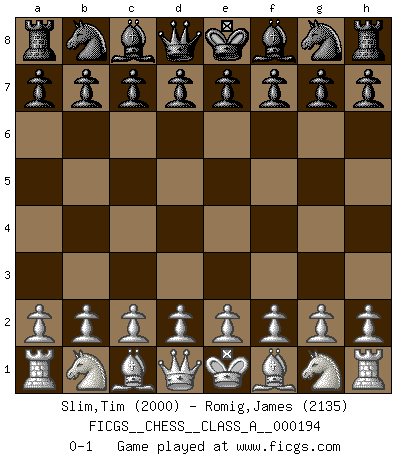 Last move : 0-1 2018 October 12 20:19:6 [Event "FICGS__CHESS__CLASS_A__000194"] [Site "FICGS"] [Date "2018.09.02"] [Round "1"] [White "Slim,Tim"] [Black "Romig,James"] [Result "0-1"] [WhiteElo "2000"] [BlackElo "2135"] 0-1 This chess game has been lost on time (started : 2018.09.02 12:29:59) Player Black won this chess game. Follow this game move after move (download)The Pawns are the soul of the game. (Francois Andre Danican Philidor) Sicherlich können nur Meister einen Stil haben. Daß ein nicht-Meister auch nur ein einziges Mal in seinem Leben eine Partie folgerecht durchführte, habe ich niemals bemerkt. (Emanuel Lasker) Un entendimiento a fondo de las continuaciones típicas del mate, hace de las combinaciones de sacrificio mas complicadas conducirlas a ellas no solo sin dificultad, sino casi de una manera natural. (Siegbert Tarrasch) Il (Jacob Murray) ne joue pas pour le bon coup, mais pour le meilleur. (Eloi Relange) No, I am still playing. (Anatoly Karpov)