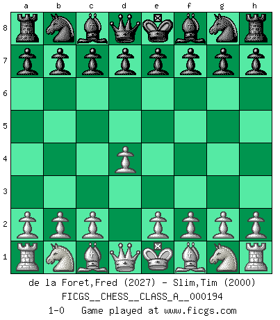 Last move : 1-0 2018 October 12 20:19:6 [Event "FICGS__CHESS__CLASS_A__000194"] [Site "FICGS"] [Date "2018.09.02"] [Round "1"] [White "de la Foret,Fred"] [Black "Slim,Tim"] [Result "1-0"] [WhiteElo "2027"] [BlackElo "2000"] 1.d4 1-0 This chess game has been lost on time (started : 2018.09.02 12:29:59) Queen's pawn Player White won this chess game. Follow this game move after move (download)There are tough players and nice guys, and I'm a tough player. (Bobby Fischer) Vom Schach wurde gesagt das Leben sei dafür nicht lange genug. Aber das ist der Fehler des Lebens, nicht des Schach'. (Irving Chernev) Aquellos que dicen entender al Ajedrez, no entienden nada. (Robert Hubner) J'ai vu le vaincu d'Echecs jouer des années durant dans l'espoir de la fête de la victoire. Car tu es plus riche de ce qu'elle existe si même elle n'est point pour toi. Ainsi de la perle du fond des mers. (Antoine de Saint-Exupéry) Without deviation from the norm, progress is not possible. (Frank Zappa)