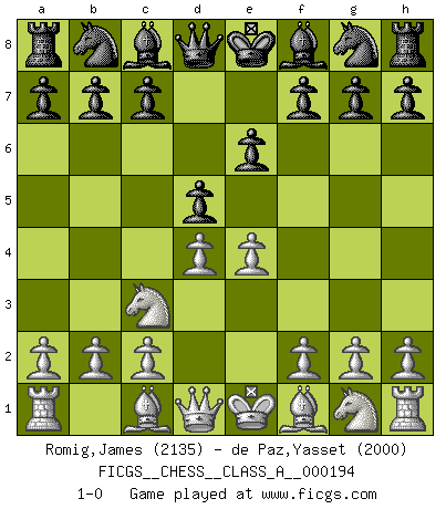 Last move : 1-0 2018 October 13 8:25:55 [Event "FICGS__CHESS__CLASS_A__000194"] [Site "FICGS"] [Date "2018.09.02"] [Round "1"] [White "Romig,James"] [Black "de Paz,Yasset"] [Result "1-0"] [WhiteElo "2135"] [BlackElo "2000"] 1.e4 e6 2.d4 d5 3.Nc3 1-0 This chess game has been lost on time (started : 2018.09.02 12:29:59) French : Paulsen variation Player White won this chess game. Follow this game move after move (download)The most powerful weapon in Chess is to have the next move. (David Bronstein) Privat ist Kortschnoi kein schlechter Mensch, sehr sympathisch. Aber während des Spiels ist er grausam. Er will dich töten. (Miguel Najdorf) ¡Examina movidas que hagan daño! Un buen ojo for movidas desvastantes es mucho mas importante que el conocimiento de principios estratégicos. (Purdy) Aux échecs, l'amour-propre est satisfait quand on remporte la victoire, mais il n'y a pas de honte à être battu. (Benjamin Franklin) If we don't succeed, we run the risk of failure. (George W. Bush)