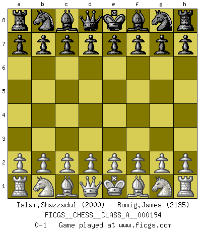 Last move : 0-1 2018 October 12 20:19:6 [Event "FICGS__CHESS__CLASS_A__000194"] [Site "FICGS"] [Date "2018.09.02"] [Round "1"] [White "Islam,Shazzadul"] [Black "Romig,James"] [Result "0-1"] [WhiteElo "2000"] [BlackElo "2135"] 0-1 This chess game has been lost on time (started : 2018.09.02 12:29:59) Player Black won this chess game. Follow this game move after move (download)Without error there can be no brilliancy. (Emanuel Lasker) Das Schachspiel ist ein See, in welchem eine Mücke baden und ein Elefant ertrinken kann. (Emanuel Lasker) Fischer era un maestro de claridad y un Rey del posicionamiento astuto. Sus oponentes podían ver hacia donde se dirigía pero eran impotentes para detenerlo. (Bruce Pandolfini) Le plus grand jeu de l'esprit jamais inventé, plus vous l'apprenez, plus vous y prenez du plaisir. (Garry Kasparov) Fame, I have already. Now I need the money. (an elderly Steinitz)