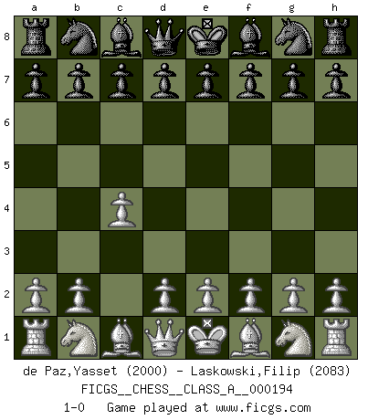 Last move : 1-0 2018 October 17 9:15:1 [Event "FICGS__CHESS__CLASS_A__000194"] [Site "FICGS"] [Date "2018.09.02"] [Round "1"] [White "de Paz,Yasset"] [Black "Laskowski,Filip"] [Result "1-0"] [WhiteElo "2000"] [BlackElo "2083"] 1.c4 1-0 This chess game has been lost on time (started : 2018.09.02 12:29:59) English Opening Player White won this chess game. Follow this game move after move (download)You know, comrade Pachman, I don't enjoy being a Minister, I would rather play Chess like you. (Che Guevara) Nach Morphy wurde nichts neues mehr in der Behandlung offener Positionen gefunden. (Mikhail Moiseyevich Botvinik) Me siento como si fuera una pieza en una partida de Ajedrez, cuando mi oponente me indica: esa pieza no puede ser movida. (Soren Kierkegaard) La solitude du joueur d'Echecs à l'approche du mat est semblable à celle du condamné. (Francis Szpiner) Happy endings are just stories that haven't finished yet. (Jane Smith in Mr & Mrs Smith)
