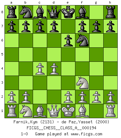 Last move : 1-0 2018 October 13 20:24:57 [Event "FICGS__CHESS__CLASS_A__000194"] [Site "FICGS"] [Date "2018.09.02"] [Round "1"] [White "Farnik,Kym"] [Black "de Paz,Yasset"] [Result "1-0"] [WhiteElo "2131"] [BlackElo "2000"] 1.d4 Nf6 2.c4 e6 3.Nf3 1-0 This chess game has been lost on time (started : 2018.09.02 12:29:59) Queen's pawn game Player White won this chess game. Follow this game move after move (download)Chess is a cold bath for the mind. (Sir John Simon) Die Idee von Capablanca, Schach als Fach in den Schulen zu lehren, ist großartig. (Fidel Castro) En la perfecta combinación de Ajedrez como en una historia corta de primera clase, toda la trama y contra trama deberá conducir hacia un final sorprendente, el interes no es mitigado hasta el último momento. (Yates and Winter) Le temps de noter son nom sur la feuille de partie, j'étais déjà en zeitnot ! D'un modeste amateur apparié lors de la première ronde d'un open contre le grand-maître Azmaïparashvili. Computer Science is no more about computers than astronomy is about telescopes. (Edsger W. Dijkstra)