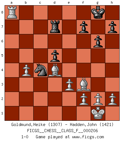 Last move : 1-0 2018 September 24 18:45:53 [Event "FICGS__CHESS__CLASS_F__000206"] [Site "FICGS"] [Date "2018.09.02"] [Round "1"] [White "Goldmund,Heike"] [Black "Hadden,John"] [Result "1-0"] [WhiteElo "1307"] [BlackElo "1421"] 1.b4 d5 2.Bb2 e6 3.a3 Nf6 4.e3 Nc6 5.c4 a6 6.Nf3 Ne7 7.Qc2 Bd7 8.Be2 c6 9.O-O b5 10.d3 bxc4 11.dxc4 Nc8 12.Nbd2 Nb6 13.Ne5 Be7 14.Nxd7 Qxd7 15.Rfd1 O-O 16.Nf3 a5 17.Ne5 Qc7 18.cxd5 exd5 19.Qxc6 Qxc6 20.Nxc6 Rfe8 21.Nxe7+ Rxe7 22.Bf3 axb4 23.axb4 Rxa1 24.Rxa1 g6 25.Bxf6 Rd7 26.Bd4 Nc4 27.Ra8+ 1-0 Polish (Sokolsky) opening Kingside Castling by player White (move 9) Kingside Castling by player Black (move 15) Player White won this chess game. Follow this game move after move (download)Chess is a more highly symbolic game, but the aggressions are therefore even more frankly represented in the play. It probably began as a war game; that is, the representation of a miniature battle between the forces of two kingdoms. (Karl Meninger) Dieses schreckliche Gefühl, dass ich gegen eine Maschine spielte, die niemals Fehler macht, zerschmetterte meinen Widerstand. (Mark Taimanov) Solo los afeminados hacen el Enroque. (Rob Sillars) On croit qu'il y a plus de mauvais joueurs que de bons joueurs, c'est faux : Il y a autant de joueurs qui gagnent que de joueurs qui perdent. (Philippe Geluck) The general who wins the battle makes many calculations in his temple before the battle is fought. The general who loses makes but few calculations beforehand. (Sun Tzu)