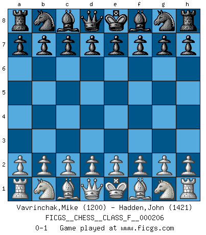 Last move : 0-1 2018 October 13 8:25:55 [Event "FICGS__CHESS__CLASS_F__000206"] [Site "FICGS"] [Date "2018.09.02"] [Round "1"] [White "Vavrinchak,Mike"] [Black "Hadden,John"] [Result "0-1"] [WhiteElo "1200"] [BlackElo "1421"] 0-1 This chess game has been lost on time (started : 2018.09.02 23:26:59) Player Black won this chess game. Follow this game move after move (download)No other master has such a terrific will to win. At the board he radiates danger, and even the strongest opponents tend to freeze, like rabbits when they smell a panther. Even his weaknesses are dangerous. As white, his opening game is predictable - you can make plans against it - but so strong that your plans almost never work. In the middle game his precision and invention are fabulous, and in the end game you simply cannot beat him. (Anonymous German Expert) Kein Schachspieler kann gut schlafen. (H. G. Wells) No hay precio que no valga la pena por la cabellera del Rey enemigo. (Koblentz) Les échecs sont un jeu terrible. Si vous n'avez pas le centre, votre adversaire a une position plus libre. Par contre, si vous avez le centre, alors vous avez vraiment quelque chose pour laquelle vous inquiéter ! (Siegbert Tarrasch) In theory there is no difference between theory and practice. In practice there is. (Yogi Berra)