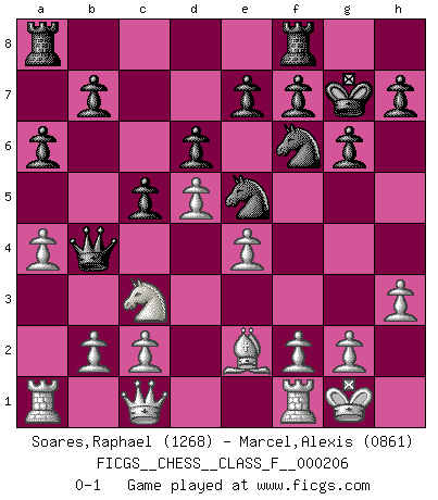 Last move : 0-1 2018 November 13 22:31:34 [Event "FICGS__CHESS__CLASS_F__000206"] [Site "FICGS"] [Date "2018.09.02"] [Round "1"] [White "Soares,Raphael"] [Black "Marcel,Alexis"] [Result "0-1"] [WhiteElo "1268"] [BlackElo "0861"] 1.e4 g6 2.d4 Bg7 3.Nf3 c5 4.d5 Qa5+ 5.Bd2 Qb6 6.Nc3 d6 7.Qc1 Bg4 8.Be2 Nf6 9.Bh6 O-O 10.Bxg7 Kxg7 11.O-O Nbd7 12.h3 Bxf3 13.Bxf3 Ne5 14.Be2 a6 15.a4 Qb4 0-1 Robatsch (Modern) defense Kingside Castling by player Black (move 9) Kingside Castling by player White (move 11) Player Black won this chess game. Follow this game move after move (download)By playing at Chess then, we may learn: First: Foresight... Second: Circumspection... Third: Caution... And lastly, we learn by Chess the habit of not being discouraged by present bad appearances in the state of our affairs, the habit of hoping for a favorable chance, and that of persevering in the secrets of resources. (Benjamin Franklin) Die Partien sind immer verschieden, die Interviews immer die gleichen. (Garry Kasparov) El Ajedrez no es una pizca de inferior al violín, y tenemos un gran número de violinistas profesionales. (Mikhail Botvinnik) Nous vivons dans un monde échiquéen : chaque jour qui passe est un défi à relever. (Philosophe Sasha) Art is the only way to run away without leaving home. (Twyla Tharp)