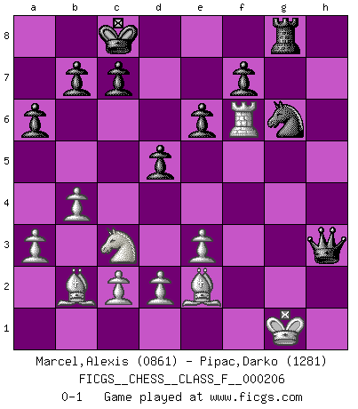 Last move : 0-1 2018 September 16 12:52:18 [Event "FICGS__CHESS__CLASS_F__000206"] [Site "FICGS"] [Date "2018.09.02"] [Round "1"] [White "Marcel,Alexis"] [Black "Pipac,Darko"] [Result "0-1"] [WhiteElo "0861"] [BlackElo "1281"] 1.f4 d5 2.Nf3 Nc6 3.e3 Bg4 4.Be2 h6 5.O-O Nf6 6.b3 e6 7.Bb2 g5 8.fxg5 hxg5 9.h3 Bxf3 10.Bxf3 Bg7 11.Nc3 a6 12.a3 Qd6 13.b4 O-O-O 14.Qe2 Ne5 15.Qf2 g4 16.Be2 gxh3 17.gxh3 Rxh3 18.Qg2 Rh6 19.Rxf6 Bxf6 20.Rf1 Rg6 21.Qxg6 Nxg6 22.Rxf6 Qg3+ 23.Kf1 Qh3+ 24.Kg1 Rg8 0-1 Bird's Opening Kingside Castling by player White (move 5) Queenside Castling by player Black (move 13) Player Black won this chess game. Follow this game move after move (download)The game of chess is the touchstone of the intellect. (Goethe) Ich habe die besten Aussichten, den ersten Preis zu gewinnen - denn jeder muss gegen Steinitz spielen, nur ich nicht! (Wilhelm Steinitz) El estómago es una parte esencial del maestro de Ajedrez. (Bent Larsen) L'attaque fait le spectacle, la défense gagne les matchs. (Dicton footballistique) Big Chess is a place for big hallucinations. (Thibault de Vassal)