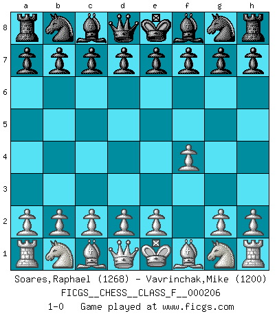 Last move : 1-0 2018 October 13 20:24:57 [Event "FICGS__CHESS__CLASS_F__000206"] [Site "FICGS"] [Date "2018.09.02"] [Round "1"] [White "Soares,Raphael"] [Black "Vavrinchak,Mike"] [Result "1-0"] [WhiteElo "1268"] [BlackElo "1200"] 1.f4 1-0 This chess game has been lost on time (started : 2018.09.02 23:26:59) Bird's Opening Player White won this chess game. Follow this game move after move (download)You need not play well - just help your opponent to play badly. (Genrikh Chepukaitis) Ich verachte Kasparow. (Viktor Kortschnoi) Cuando no sepas que mover, espera por una idea que se le venga a la la cabeza de tu oponente. Tenlo por seguro de que esa idea estará incorrecta. (Siegbert Tarrasch) Les sacrifices démontrent seulement que quelqu'un a gaffé. (Savielly Tartacover) Perception is reality. (Immanuel Kant)