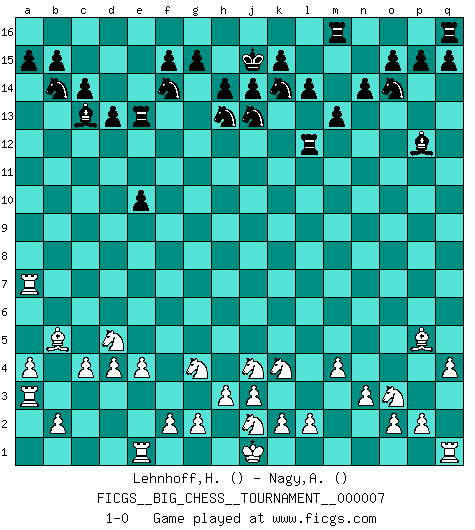 Last move : 1-0 2007 September 19 12:20:20 [Event "FICGS__BIG_CHESS__TOURNAMENT__000007"] [Site "FICGS"] [Date "2007.05.17"] [Round "1"] [White "Lehnhoff,Heinz-Georg"] [Black "Nagy,Attila"] [Result "1-0"] [WhiteElo ""] [BlackElo ""] 1.j2-k4 j15-h13 2.p1-o3 h16-o10 3.h2-g4 d15-d13 4.e2-e4 e15-e13 5.b1-c3 f16-c13 6.m2-m4 c16-l8 7.k1-h2 m15-m13 8.h1-l4 l16-p12 9.d2-d4 n15-n14 10.c1-h6 c15-c14 11.l1-p5 o16-g9 12.n2-n3 e16-e14 13.l4-f9 g16-f14 14.f9-f6 g9-h8 15.h6-g7 h8-g7 16.f6-g7 p16-o14 17.f1-b5 h15-k14 18.o1-f9 b16-d15 19.f9-h11 l8-h11 20.b5-h11 e14-e16 21.g7-m7 d15-b14 22.m1-m3 k16-h15 23.m3-l3 l15-l14 24.g1-j2 h15-j13 25.h11-b5 e13-e12 26.q2-q4 e12-e11 27.a2-a4 j16-j15 28.c3-d5 e16-e12 29.c2-c4 a16-e16 30.a1-a3 e16-e13 31.m7-l7 o10-l7 32.l3-l7 e11-e10 33.h2-j4 e12-l12 34.l7-a7 1-0 Follow this game move after move (download)Without error there can be no brilliancy. (Emanuel Lasker) Zeige mir drei Eröffnungsvarianten und ich beweise dir, dass zwei davon inkorrekt sind. (Emanuel Lasker) Debió haber existido una vez en que los hombres eran semidióses, de otra manera no hubiesen podido inventar el Ajedrez. (Gustav Schenk) C'est une question de caractère, Beaucoup de gens perdent leur motivation très vite. D'autres, ils sont rares, peuvent la conserver très longtemps. J'aime les échecs, encore aujourd'hui je suis heureux d'analyser des parties. J'aime toujours gagner, je déteste encore perdre. Bien jouer est important pour mon intégrité intellectuelle et morale. Et puis les échecs vivent en ce moment une période historique grâce à Internet. Ils se développent dans les systèmes éducatifs à travers le monde. Ils sortent de leur ghetto, et c'est mon rôle de mener à bien cette révolution. (Gary Kasparov) Employ the attack like tactic of defense. (Chinese proverb)