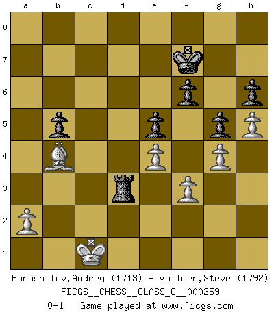 Last move : 0-1 2018 October 15 17:3:9 [Event "FICGS__CHESS__CLASS_C__000259"] [Site "FICGS"] [Date "2018.09.03"] [Round "1"] [White "Horoshilov,Andrey"] [Black "Vollmer,Steve"] [Result "0-1"] [WhiteElo "1713"] [BlackElo "1792"] 1.e4 e5 2.Nf3 Nc6 3.d4 exd4 4.Nxd4 Nxd4 5.Qxd4 Nf6 6.Bg5 Be7 7.Nc3 d6 8.O-O-O O-O 9.Be2 Be6 10.h4 h6 11.Bf4 Nd7 12.g3 Bf6 13.Qb4 Re8 14.Nd5 Bxd5 15.Rxd5 a5 16.Qd2 Be5 17.c3 Nb6 18.Rxe5 dxe5 19.Qxd8 Raxd8 20.Be3 Nc8 21.g4 Nd6 22.f3 f6 23.Bf2 g6 24.Kc2 Kg7 25.Rg1 g5 26.h5 c6 27.Bb6 Ra8 28.Rd1 Nc8 29.Bc5 b6 30.Rd7+ Kh8 31.Be3 c5 32.Bb5 Re7 33.Rd8+ Kg7 34.Bc6 Rb8 35.Rd1 Na7 36.Bd5 Nb5 37.Bc4 Nc7 38.Be2 Ne6 39.Bf1 Rd8 40.Rxd8 Nxd8 41.Bd2 Ne6 42.Be3 Nf4 43.Bf2 Rd7 44.Be1 Kf7 45.Kc1 Nd3+ 46.Bxd3 Rxd3 47.b4 axb4 48.cxb4 cxb4 49.Bxb4 b5 0-1 Scotch game Queenside Castling by player White (move 8) Kingside Castling by player Black (move 8) Player Black won this chess game. Follow this game move after move (download)Chess is war over the board. The object is to crush the opponents mind. (Bobby Fischer) Die Idee von Capablanca, Schach als Fach in den Schulen zu lehren, ist großartig. (Fidel Castro) Yo creo que el Ajedrez posee una magia que es también una ayuda en la edad avanzada. Una rodilla reumática es olvidada durante una partida de Ajedrez y otros eventos pueden parecer algo sin importancia comparada a una catástrofe en el tablero de Ajedrez. (Vlastimil Hort) Le joueur d'Echecs qui veut atteindre le top est obligé de développer son propre credo créatif. Alexeï Stepanovicth Souétine. Il est facile d'écrire des livres ! Ce qui est difficile, c'est de jouer ! (Alexeï Stepanovicth Souétine) The only difference between a tax man and a taxidermist is that the taxidermist leaves the skin. (Mark Twain)