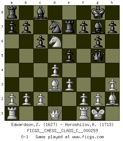 Last move : 0-1 2018 December 21 14:19:28 [Event "FICGS__CHESS__CLASS_C__000259"] [Site "FICGS"] [Date "2018.09.03"] [Round "1"] [White "Edwardson,Zachariah"] [Black "Horoshilov,Andrey"] [Result "0-1"] [WhiteElo "1627"] [BlackElo "1713"] 1.d4 Nf6 2.Nf3 g6 3.Bf4 d6 4.e3 Bg7 5.h3 c6 6.Nbd2 Nbd7 7.Be2 O-O 8.O-O Re8 9.Bh2 e5 10.Nc4 Ne4 11.Bd3 Ng5 12.Nxg5 Qxg5 13.Nxd6 Re7 0-1 This chess game has been lost on time (started : 2018.09.03 2:51:58) King's Indian : London system Kingside Castling by player Black (move 7) Kingside Castling by player White (move 8) Player Black won this chess game. Follow this game move after move (download)Avoid the crowd. Do your own thinking independently. Be the Chess player, not the Chess piece. (Ralph Charell) Der 70jährige Viktor Kortschnoi: Die Rentenanstalt wollte mich zwingen in Rente zu gehen. Meine Frau erhält jetzt eine Pension- und ich zahle weiter in die Rentenkasse ein! (Viktor Kortschnoi) Tu sabes que vas a perder. Aún cuando tenía la ventaja, yo sabía que iba a perder. - al estar jugando con Fischer (Andrew Soltis) Il n'y a pas eu de défaite parce que je ne crois pas que cet ordinateur ait jamais existé. IBM a triché en refusant d'imprimer les modes de recherche de la machine. C'est évident, pendant le match, des coups décisifs ont été joués par des êtres humains. Aujourd'hui, les meilleurs spécialistes en informatique ne peuvent toujours pas expliquer comment Deep-Blue a pu jouer contre la logique des ordinateurs. IBM a gagné une guerre de communication, mais ils sont incapables de prouver que l'ordinateur a gagné tout seul. (Garry Kasparov) The smarter you play, the luckier you'll be. (Mark Pilarski)