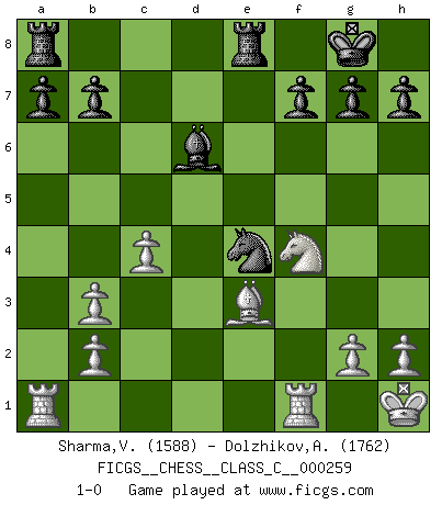 Last move : 1-0 2018 December 13 13:33:23 [Event "FICGS__CHESS__CLASS_C__000259"] [Site "FICGS"] [Date "2018.09.03"] [Round "1"] [White "Sharma,Vivek"] [Black "Dolzhikov,Aleksandr"] [Result "1-0"] [WhiteElo "1588"] [BlackElo "1762"] 1.e4 e5 2.f4 d5 3.exd5 exf4 4.Nc3 Nf6 5.Bc4 Be7 6.Nf3 O-O 7.d3 Bd6 8.Bd2 Re8+ 9.Ne2 c6 10.O-O cxd5 11.Bb3 Nc6 12.Nxf4 Bg4 13.c4 Bxf3 14.Qxf3 dxc4 15.dxc4 Qb6+ 16.Kh1 Nd4 17.Qh3 Nxb3 18.axb3 Ne4 19.Qe3 Qxe3 20.Bxe3 1-0 KGD : Falkbeer counter-gambit Kingside Castling by player Black (move 6) Kingside Castling by player White (move 10) Player White won this chess game. Follow this game move after move (download)Fischer is under obligation to nobody. (Joseph Platz) Im Hotelzimmer gab es nur zwei Schaben. (Über die Turnierbedingungen) (Peter Swidler) La señal de un Gran Maestro es su habilidad de ganar una partida rápidamente y sin dolor. (Irving Chernev) Nous vivons dans un monde échiquéen : chaque jour qui passe est un défi à relever. (Philosophe Sasha) Art is the triumph over chaos. (John Cheever)