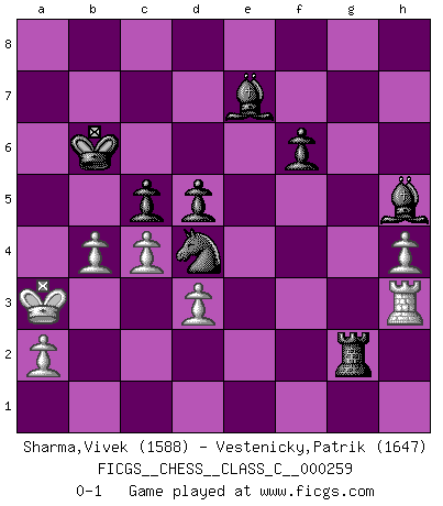 Last move : 0-1 2018 September 10 3:58:40 [Event "FICGS__CHESS__CLASS_C__000259"] [Site "FICGS"] [Date "2018.09.03"] [Round "1"] [White "Sharma,Vivek"] [Black "Vestenicky,Patrik"] [Result "0-1"] [WhiteElo "1588"] [BlackElo "1647"] 1.e4 e5 2.f4 exf4 3.Nf3 g5 4.h4 g4 5.Ne5 Nf6 6.Nxg4 Nxe4 7.Qf3 Qe7 8.Be2 Ng3 9.Rh3 Nxe2 10.Qxe2 d6 11.Qxe7+ Bxe7 12.d3 Bxg4 13.Rh2 f3 14.gxf3 Bxf3 15.Nd2 Bh5 16.Ne4 Rg8 17.Be3 Nc6 18.Kd2 d5 19.Ng5 h6 20.Nh3 Ne5 21.Ng1 O-O-O 22.Bxh6 Rxg1 23.Rxg1 Nf3+ 24.Kc1 Nxg1 25.Bg5 f6 26.Be3 Nf3 27.Rh3 Rg8 28.Bxa7 b6 29.c4 Rg1+ 30.Kc2 Kb7 31.Bxb6 Kxb6 32.b4 Rg2+ 33.Kb3 Nd4+ 34.Ka3 c5 0-1 KGA : Kieseritsky, Berlin defense Queenside Castling by player Black (move 21) Player Black won this chess game. Follow this game move after move (download)Let the perfectionist play postal. (Yasser Seirawan) Mutter, ich bin eben Ex-Weltmeister geworden. --beim nach Hause Kommen nach dem Verlust des WM-Titels an Mihail Botvinnik -- (Mikhail Nekhemyevich Tal) Los Peones son el alma de una partida de Ajedrez. (Francois Andre Danican Philidor) Avant la finale, les dieux ont créé le milieu de partie. (Tarrasch) The worth of a book is to be measured by what you can carry away from it. (James Bryce)