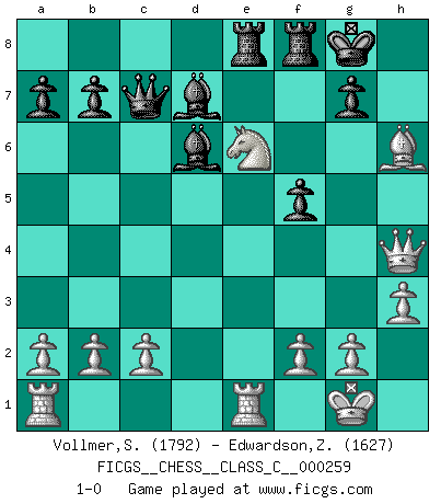 Last move : 1-0 2018 December 12 1:22:28 [Event "FICGS__CHESS__CLASS_C__000259"] [Site "FICGS"] [Date "2018.09.03"] [Round "1"] [White "Vollmer,Steve"] [Black "Edwardson,Zachariah"] [Result "1-0"] [WhiteElo "1792"] [BlackElo "1627"] 1.e4 e6 2.d4 d5 3.Nc3 dxe4 4.Nxe4 Nd7 5.Nf3 Ngf6 6.Bd3 c5 7.dxc5 Nxe4 8.Bxe4 Nxc5 9.Qe2 Qc7 10.O-O Bd7 11.Re1 Bd6 12.h3 Nxe4 13.Qxe4 O-O 14.Ng5 f5 15.Qh4 h6 16.Nxe6 Rae8 17.Bxh6 1-0 This chess game has been lost on time (started : 2018.09.03 2:51:58) French : Rubinstein variation Kingside Castling by player White (move 10) Kingside Castling by player Black (move 13) Player White won this chess game. Follow this game move after move (download)I know people who have all the will in the world, but still can't play good Chess. (Bobby Fischer) Ich war zu klein für die Schach-Schülermannschaft! (Woody Allen) Yo creo que el Ajedrez posee una magia que es también una ayuda en la edad avanzada. Una rodilla reumática es olvidada durante una partida de Ajedrez y otros eventos pueden parecer algo sin importancia comparada a una catástrofe en el tablero de Ajedrez. (Vlastimil Hort) On n'a jamais que l'âge auquel on a commence à jouer aux échecs car après on cesse de vieillir. (Capablanca) Information on the Internet is subject to the same rules and regulations as conversation at a bar. (George Lundberg)