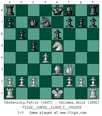Last move : 1-0 2018 September 30 20:43:50 [Event "FICGS__CHESS__CLASS_C__000259"] [Site "FICGS"] [Date "2018.09.03"] [Round "1"] [White "Vestenicky,Patrik"] [Black "Vellema,Jelle"] [Result "1-0"] [WhiteElo "1647"] [BlackElo "1692"] 1.e4 e6 2.d4 d5 3.Nc3 dxe4 4.Nxe4 Nd7 5.Nf3 Ngf6 6.Nxf6+ Nxf6 7.Bb5+ c6 8.Bd3 c5 9.Be3 b6 10.Ne5 Qc7 11.Bb5+ Bd7 12.Bxd7+ Nxd7 13.Qf3 1-0 French : Rubinstein variation Player White won this chess game. Follow this game move after move (download)Pawn endings are to Chess what putting is to golf. (Cecil Purdy) Fischer: 'Remis!?' Uhlmann: 'Aber es muss doch dreimal Zugwiederholung sein!' Fischer: 'Sie nehmen das Remis an, wie ich es sage, sonst spiele ich weiter und werde Sie dann schlagen!' (Robert James Fischer) Las leyes del Ajedrez no permiten una libre elección: tienes que mover quieras o no. (Emanuel Lasker) Il n'y a plus de joueurs du niveau de Jacob Murray dont la seule quête est le beau jeu, le plaisir de voir les pièces construire quelque chose. Sur 10 idées à la minute, 9 seront sans intérêt, la dernière s'avèrera géniale. (Christian Bauer) No man has ever achieved immortality in his own life time. (Unknown)
