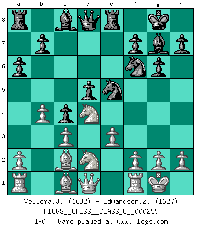 Last move : 1-0 2018 December 24 14:52:33 [Event "FICGS__CHESS__CLASS_C__000259"] [Site "FICGS"] [Date "2018.09.03"] [Round "1"] [White "Vellema,Jelle"] [Black "Edwardson,Zachariah"] [Result "1-0"] [WhiteElo "1692"] [BlackElo "1627"] 1.d4 d5 2.Nf3 Nf6 3.e3 c5 4.c3 Nbd7 5.Bd3 g6 6.Nbd2 Bg7 7.O-O O-O 8.b4 c4 9.Bc2 Re8 10.Ba4 a6 11.Bc2 e5 12.dxe5 Nxe5 13.Nd4 1-0 This chess game has been lost on time (started : 2018.09.03 2:51:58) Queen's pawn game Kingside Castling by player White (move 7) Kingside Castling by player Black (move 7) Player White won this chess game. Follow this game move after move (download)There are two types of sacrifices: correct ones and mine. (Mikhail Tal) Gewöhnliche Menschen denken nur daran, wie sie ihre Zeit verbringen. Ein intelligenter Mensch versucht, sie auszunutzen. (Arthur Schopenhauer) En un gambito tu regalas un Peón por el bién de tomar un juego perdido. (Samuel Standige Boden) Le jeu d'échecs fait naître et fortifie en nous plusieurs qualités précieuses dans le cours de l'existence, telles que la prévoyance, la circonspection, la prudence, et la persévérance. (Benjamin Franklin - 1783, la morale des échecs) Do you know these so called Volunteers don't even get paid! (Simpsons)