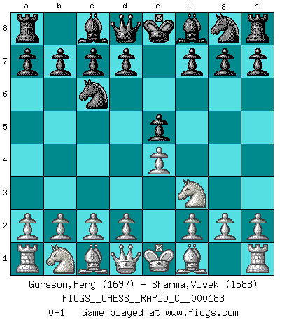 Last move : 0-1 2018 October 5 18:55:6 [Event "FICGS__CHESS__RAPID_C__000183"] [Site "FICGS"] [Date "2018.09.03"] [Round "1"] [White "Gursson,Ferg"] [Black "Sharma,Vivek"] [Result "0-1"] [WhiteElo "1697"] [BlackElo "1588"] 1.e4 e5 2.Nf3 Nc6 0-1 This chess game has been lost on time (started : 2018.09.03 4:31:48) King's pawn game Player Black won this chess game. Follow this game move after move (download)Pawns are born free, yet they are everywhere in chains. (Rick Kennedy) Obwohl ich vom Stil her kaum zu den Priestern der Schachkunst gezählt werde, halte ich Schach doch für eine Kunst. (Tigran Petrosjan) Un buen jugador siempre tiene buena suerte. (José Raúl Capablanca) Aucun coup ne doit être joué sans but. (Pedro Damiano) When you stop learning you start dying. (M. Scott Adams)
