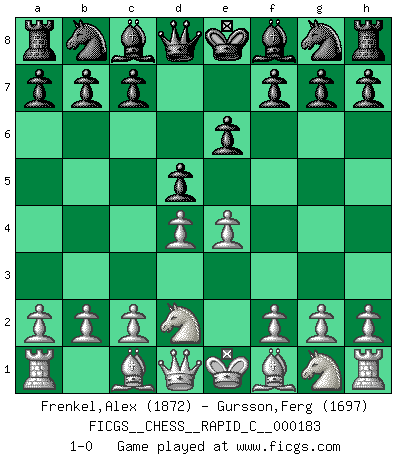 Last move : 1-0 2018 October 5 18:55:6 [Event "FICGS__CHESS__RAPID_C__000183"] [Site "FICGS"] [Date "2018.09.03"] [Round "1"] [White "Frenkel,Alex"] [Black "Gursson,Ferg"] [Result "1-0"] [WhiteElo "1872"] [BlackElo "1697"] 1.e4 e6 2.d4 d5 3.Nd2 1-0 This chess game has been lost on time (started : 2018.09.03 4:31:48) French : Tarrasch Player White won this chess game. Follow this game move after move (download)It is peculiar but a fact nevertheless, that gamblers in chess always have enthusiastic followers. (Botvinnik) Wenn man heute mit 14 Jahren noch kein GM ist, kann man es vergessen. (Viswanathan Anand) A través de las casillas del tablero, los Indios explican el movimiento del tiempo y la edad, las influencias mas altas que controlan el mundo y los lazos que vinculan al Ajedrez con el alma humana. (Al-Masudi) Les ravages du H expliquent la différence de niveau entre Tal et Thal [Abergel]. Difficult things take a long time, impossible things a little longer. (Author unknown)