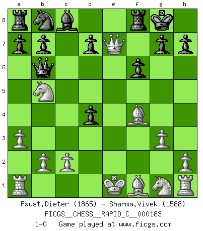 Last move : 1-0 2018 October 29 9:10:37 [Event "FICGS__CHESS__RAPID_C__000183"] [Site "FICGS"] [Date "2018.09.03"] [Round "1"] [White "Faust,Dieter"] [Black "Sharma,Vivek"] [Result "1-0"] [WhiteElo "1865"] [BlackElo "1588"] 1.e4 e5 2.f4 Qh4+ 3.g3 Qf6 4.fxe5 Qxe5 5.Nc3 Be7 6.d4 Qa5 7.a3 Nf6 8.Bd2 c5 9.e5 cxd4 10.Nb5 Qb6 11.exf6 Bxf6 12.Qe2+ Be7 13.Bg5 f6 14.Bf4 O-O 15.Qxe7 1-0 This chess game has been lost on time (started : 2018.09.03 4:31:48) King's gambit Kingside Castling by player Black (move 14) Player White won this chess game. Follow this game move after move (download)Good offense and good defense both begin with good development. (Bruce A. Moon) Besser ein falscher Plan, logisch durchgeführt, als gar kein Plan. (Viktor Kortschnoi) Aquel que teme a un Peón de Reina aislado, debería de retirarse del Ajedrez. (Siegbert Tarrasch) Avant la finale, les dieux ont créé le milieu de partie. (Tarrasch) Train yourself to let go of everything you fear to lose. (Master Yoda in Star Wars ep.3)