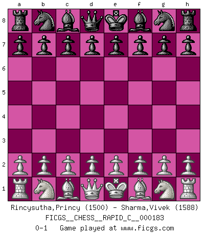 Last move : 0-1 2018 October 3 6:31:39 [Event "FICGS__CHESS__RAPID_C__000183"] [Site "FICGS"] [Date "2018.09.03"] [Round "1"] [White "Rincysutha,Princy"] [Black "Sharma,Vivek"] [Result "0-1"] [WhiteElo "1500"] [BlackElo "1588"] 0-1 This chess game has been lost on time (started : 2018.09.03 4:31:48) Player Black won this chess game. Follow this game move after move (download)Personally, I rather look forward to a computer program winning the world Chess Championship. Humanity needs a lesson in humility. (Richard Dawkings) Ich habe Putins Aufstieg an die Macht beobachtet und seine Politik, die demokratischen Institutionen meines Landes zu zerstören. (Garry Kasparov) Alguna parte de un error es siempre correcto. (Savielly Tartakover) Ne tendez aucun piège pour le plaisir ! Ne jouez rien dans l'espoir que l'adversaire réagisse de façon stupide ! Prenez toujours pour acquis que l'adversaire va trouver le meilleur coup ! Ne jouez jamais de coup dans l'espoir que l'adversaire ne voie pas la menace ! Chacun de vos coups doit améliorer la position d'une façon ou d'une autre. There are two kinds of tragedy in this world, one is not getting what you want and the other is getting. (Lord of war)