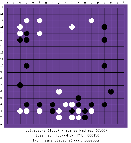 Last move : 1-0 2018 October 26 22:1:9 [Event "FICGS__GO__TOURNAMENT_KYU__000190 "] [Site "FICGS"] [Date "2018.09.03"] [Round "1"] [Black "Lot,Sosuke "] [White "Soares,Raphael "] [Result "1-0"] [Rating 1 "1363"] [Rating 2 "0500"] 1.q16 d17 2.q4 c3 3.d15 c15 4.c14 c16 5.d14 f17 6.d10 o3 7.r6 o17 8.q14 l16 9.q10 k4 10.c7 f15 11.h3 j3 12.h4 f3 13.l3 j2 14.m5 l4 15.m4 m3 16.n3 m2 17.n2 l2 18.o4 j6 19.d4 d3 20.f4 1-0 This go game has been lost on time (started : 2018.09.03 23:39:58) Here are the names of the openings (joseki) played in the four corners : Corner d16 : d17 d15Komoku (Somok, Xiao~mu`) 3-4 Point. The komoku (3-4) point is the traditional corner enclosure move..Ikken Takagakari (Hankan Nop'dakeolch'im, Yi Gaogua`jiao~, 1-Space High Approach). The 5-4 approach move has become more popular in modern times, as modern Go emphasizes speed and influence. Corner q4 : q4 o3Hoshi (Hwajeom, Seongjeom, Xingwei`) 4-4 Point. The star or hoshi (4-4) point, emphasizing influence at the potential expense of territory.Ikken Kakari (Hankan Keolch'im, Yi Gua`jiao~, 1-Space Low Approach). White 2 is the standard approach move to the 4-4. Corner q16 : q16 o17Hoshi (Hwajeom, Seongjeom, Xingwei`) 4-4 Point. The star or hoshi (4-4) point, emphasizing influence at the potential expense of territory.Ikken Kakari (Hankan Keolch'im, Yi Gua`jiao~, 1-Space Low Approach). White 2 is the standard approach move to the 4-4. Corner d4 : c3 c7San-San (Sam-Sam, San-San) 3-3 Point. The San-San (3-3) point, emphasizing territory at the expense of influence. Player Black won this Go (weiqi, baduk) game.Follow this game move after move (download ) Don't reduce your own liberties. (Bill Taylor) I don't believe in psychology. I believe in good moves. (Bobby Fischer)