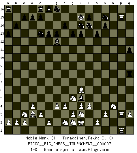 Last move : 1-0 2007 August 13 3:26:47 [Event "FICGS__BIG_CHESS__TOURNAMENT__000007"] [Site "FICGS"] [Date "2007.05.17"] [Round "1"] [White "Noble,Mark"] [Black "Turakainen,Pekka I."] [Result "1-0"] [WhiteElo ""] [BlackElo ""] 1.g2-g4 a15-a13 2.n2-n3 b15-b14 3.h1-c6 b16-c14 4.o1-g8 p16-o14 5.g8-o15 n15-n14 6.d2-d4 o16-m14 7.c1-p13 m16-o16 8.p13-o14 o16-o15 9.o14-j9 o15-o2 10.p1-q3 o2-p2 11.m1-p1 p2-p1 12.q1-p1 q16-o16 13.j9-p15 o16-o13 14.q3-o4 o13-c13 15.c6-e4 g15-g13 16.e2-e3 h16-e13 17.e4-e13 c14-e13 18.f1-d3 q15-q13 19.k2-k4 q13-q12 20.l1-k2 m14-p11 21.h3-h4 k16-l14 22.p15-h8 c13-c8 23.k2-m4 c16-a14 24.b1-c3 j14-j13 25.g1-h3 m15-m13 26.h3-j5 f15-f13 27.h8-k6 p11-k6 28.m4-k6 q12-q11 29.h2-k3 c8-q8 30.q2-q3 k15-k13 31.k1-h2 l16-g12 32.j1-k2 j16-k15 33.p1-p15 j15-l16 34.e1-p1 l16-n15 35.p1-p3 h15-k14 36.a1-p1 a14-k5 37.l2-l4 1-0 This big chess game has been lost on time (started : 2007.05.17 21:10:36) Follow this game move after move (download)For surely of all the drugs in the world, Chess must be the most permanently pleasurable. (Assiac) Die westlichen Werte sind eine Sprache, welche die Putin-Administration nicht versteht. (Garry Kasparov) El Ajedrez se juega con la mente... ¡no con las manos!. (Renaud y Kahn) La conception d'un plan est le processus par lequel un joueur exploite les avantages de sa position tout en s'efforçant d'en réduire au minimum les inconvénients. Afin de garantir le succès, un plan doit toujours se fonder sur un diagnostic objectif des particularités d'une position. La conception d'un plan est d'autant plus difficile que la position est équilibrée, et grandement facilitée lorsqu'il n'existe qu'un seul plan susceptible de répondre aux exigences de la position. (Harry Golombek) Man is still the most extraordinary computer of all. (John F. Kennedy)