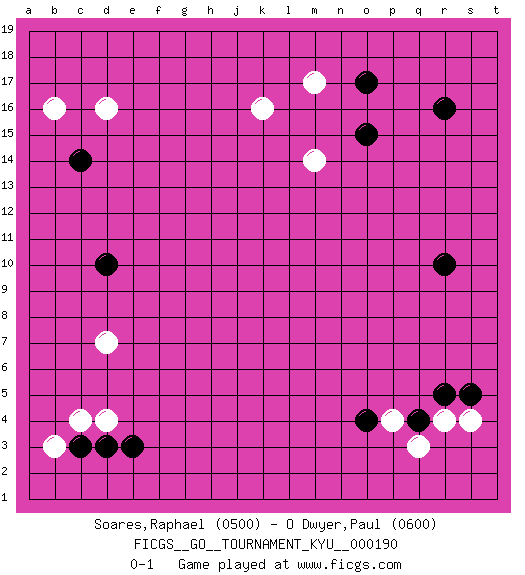 Last move : 0-1 2018 October 20 9:35:39 [Event "FICGS__GO__TOURNAMENT_KYU__000190"] [Site "FICGS"] [Date "2018.09.03"] [Round "1"] [Black "Soares,Raphael"] [White "O Dwyer,Paul"] [Result "0-1"] [Rating 1 "0500"] [Rating 2 "0600"] 1.r16 d4 2.o4 q3 3.q4 r4 4.r5 s4 5.s5 d16 6.r10 k16 7.c14 b16 8.d10 d7 9.o17 m17 10.o15 m14 11.c3 c4 12.d3 b3 13.e3 p4 0-1 This go game has been lost on time (started : 2018.09.03 23:39:58) Here are the names of the openings (joseki) played in the four corners : Corner q4 : o4 q3 Ootakamoku (Chaogao) 6-4 Point. The large takamoku (high) point (6-4), experimented with during the "new fuseki" movement in Japan in the 1930's. This point is seldom played as the initial corner point nowadays. Corner d16 : d16 c14 Hoshi (Hwajeom, Seongjeom, Xingwei`) 4-4 Point. The star or hoshi (4-4) point, emphasizing influence at the potential expense of territory. Ikken Kakari (Hankan Keolch'im, Yi Gua`jiao~, 1-Space Low Approach). Black 2 is the standard approach move to the 4-4. Player White won this Go (weiqi, baduk) game. Follow this game move after move (download)To invade, need 20 points in open area; otherwise, keshi is best. (Yang Yilun, 7p) Have no fear of perfection - you'll never reach it. (Salvador Dali)