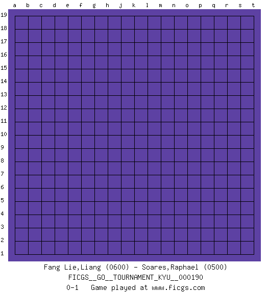 Last move : 0-1 2018 October 4 6:50:27 [Event "FICGS__GO__TOURNAMENT_KYU__000190"] [Site "FICGS"] [Date "2018.09.03"] [Round "1"] [Black "Fang Lie,Liang"] [White "Soares,Raphael"] [Result "0-1"] [Rating 1 "0600"] [Rating 2 "0500"] 0-1 This go game has been lost on time (started : 2018.09.03 23:39:58) Here are the names of the openings (joseki) played in the four corners : Player White won this Go (weiqi, baduk) game. Follow this game move after move (download)Studying go is a wonderful way to develop both the creative as well as the logical abilities of children because to play it both sides of the brain are necessary. (Cho Chikun) Vladimir Ras-Putin is still alive... He is also a good actor, I saw him in the Lord of the Rings. (Rodolfo d'Ettorre)