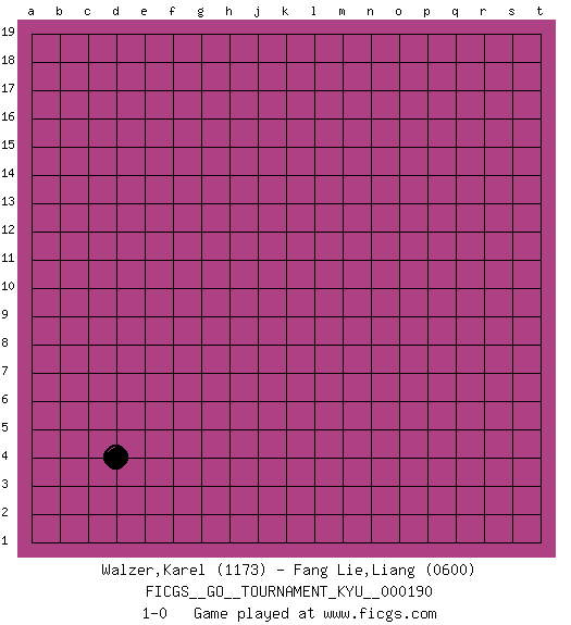 Last move : 1-0 2018 October 4 6:50:27 [Event "FICGS__GO__TOURNAMENT_KYU__000190"] [Site "FICGS"] [Date "2018.09.03"] [Round "1"] [Black "Walzer,Karel"] [White "Fang Lie,Liang"] [Result "1-0"] [Rating 1 "1173"] [Rating 2 "0600"] 1.d4 1-0 This go game has been lost on time (started : 2018.09.03 23:39:58) Here are the names of the openings (joseki) played in the four corners : Corner d4 : d4 1-0 Hoshi (Hwajeom, Seongjeom, Xingwei`) 4-4 Point. The star or hoshi (4-4) point, emphasizing influence at the potential expense of territory. Player Black won this Go (weiqi, baduk) game. Follow this game move after move (download)Don't overlook the edge of the board. (Anonymous) Panic is a sudden desertion of us, an a going over to the enemy of our imagination. (Christian Nevell Bovee)
