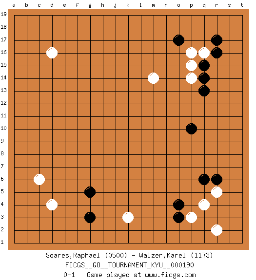 Last move : 0-1 2018 October 23 21:52:54 [Event "FICGS__GO__TOURNAMENT_KYU__000190"] [Site "FICGS"] [Date "2018.09.03"] [Round "1"] [Black "Soares,Raphael"] [White "Walzer,Karel"] [Result "0-1"] [Rating 1 "0500"] [Rating 2 "1173"] 1.r16 d4 2.o4 d16 3.p10 q4 4.q6 r5 5.r6 p3 6.o3 r2 7.o17 q16 8.q15 p16 9.r17 p15 10.q14 p14 11.q13 m14 12.g3 k3 13.g5 c6 0-1 This go game has been lost on time (started : 2018.09.03 23:39:58) Here are the names of the openings (joseki) played in the four corners : Corner q4 : o4 q4 Ootakamoku (Chaogao) 6-4 Point. The large takamoku (high) point (6-4), experimented with during the "new fuseki" movement in Japan in the 1930's. This point is seldom played as the initial corner point nowadays. Corner d4 : d4 g3 Hoshi (Hwajeom, Seongjeom, Xingwei`) 4-4 Point. The star or hoshi (4-4) point, emphasizing influence at the potential expense of territory. Niken Kakari (Dukan Keolch'im, E`r Gua`jiao~, 2-Space Low Approach). White typically answers by 7-3 or 3-5 (which is not joseki). Player White won this Go (weiqi, baduk) game. Follow this game move after move (download)Do not fear furikawari. (Anonymous) The faster the computer, the slower the brain. (Thibault de Vassal)