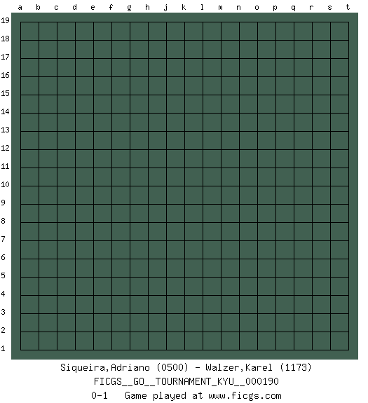 Last move : 0-1 2018 October 4 6:50:27 [Event "FICGS__GO__TOURNAMENT_KYU__000190"] [Site "FICGS"] [Date "2018.09.03"] [Round "1"] [Black "Siqueira,Adriano"] [White "Walzer,Karel"] [Result "0-1"] [Rating 1 "0500"] [Rating 2 "1173"] 0-1 This go game has been lost on time (started : 2018.09.03 23:39:58) Here are the names of the openings (joseki) played in the four corners : Player White won this Go (weiqi, baduk) game. Follow this game move after move (download)Learn to play under the stones. (Anonymous) All war is based on deception. (Sun Tzu)