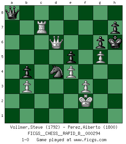 Last move : 1-0 2018 November 13 20:19:34 [Event "FICGS__CHESS__RAPID_B__000294"] [Site "FICGS"] [Date "2018.09.04"] [Round "1"] [White "Vollmer,Steve"] [Black "Perez,Alberto"] [Result "1-0"] [WhiteElo "1792"] [BlackElo "1800"] 1.e4 e5 2.Nf3 Nc6 3.Bb5 a6 4.Ba4 b5 5.Bb3 d6 6.c3 Be6 7.d4 Bxb3 8.Qxb3 Na5 9.Qc2 exd4 10.cxd4 c5 11.O-O Rc8 12.dxc5 Rxc5 13.Qe2 Qc7 14.Nbd2 Nc4 15.Nb3 Rh5 16.Bf4 Nf6 17.Rad1 Be7 18.Rfe1 O-O 19.Nbd4 Nd7 20.Nf5 Nde5 21.Nxe7+ Qxe7 22.Nxe5 Rxe5 23.Bxe5 dxe5 24.b3 Na5 25.Rc1 Nb7 26.Qc2 Nd8 27.Qc5 Qf6 28.Qa7 g6 29.f3 Qd6 30.a4 Ne6 31.axb5 axb5 32.Qe3 Nd4 33.g3 Ra8 34.Ra1 Rc8 35.Rec1 Rc2 36.Ra8+ Kg7 37.Rxc2 Nxc2 38.Qe2 Qd4 39.Kg2 Ne3 40.Kh3 Kh6 41.Ra2 b4 42.Rd2 Qc3 43.Rd3 Qc8 44.g4 Nc2 45.Kg3 Nd4 46.Qd2+ Kg7 47.h4 Ne6 48.Qb2 f6 49.Qd2 Nf4 50.Rd7+ Kh6 51.Qd6 Ne2 52.Kf2 Nd4 53.Rc7 Qa8 54.g5+ fxg5 55.hxg5+ 1-0 Ruy Lopez : Caro variation Kingside Castling by player White (move 11) Kingside Castling by player Black (move 18) Player White won this chess game. Follow this game move after move (download)Nothing excites jaded Grandmasters more than a theoretical novelty. (Dominic Lawson) Wer wird heute Abend ihr Gegner sein? -- Heute Abend spiele ich gegen die schwarzen Steine. (Akiba Rubinstein) Tu puedes aprender mucho mas de una partida que pierdas que de una partida ganada. Tendras que perder cientos de partidas antes de llegar a ser un buen jugador. (Jose Raul Capablanca) La vie et les Echecs sont tous les deux une lutte constante. (Lasker) Men should grow up. - Yeah. And dogs should stop licking themselves. It's not gonna happen. (Gregory House to Dr. Cameron, House M.D.)
