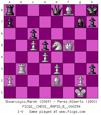 Last move : 1-0 2018 November 1 14:44:35 [Event "FICGS__CHESS__RAPID_B__000294"] [Site "FICGS"] [Date "2018.09.04"] [Round "1"] [White "Skwarczylo,Marek"] [Black "Perez,Alberto"] [Result "1-0"] [WhiteElo "2069"] [BlackElo "1800"] 1.d4 Nf6 2.Nf3 e6 3.c4 d5 4.Nc3 g6 5.Bf4 c6 6.e3 Bg7 7.h3 O-O 8.Qc2 Nh5 9.Bh2 f5 10.Be2 Nf6 11.O-O Nbd7 12.Rab1 Ne4 13.b4 Ndf6 14.c5 Kh8 15.b5 g5 16.bxc6 bxc6 17.Ne5 Qe8 18.Nxe4 dxe4 19.Nc4 Nd5 20.Rb3 Qg6 21.Bd6 Rg8 22.Ne5 Qe8 23.f3 g4 24.fxe4 gxh3 25.exd5 exd5 26.Rxf5 Bxf5 27.Qxf5 Rf8 28.Bxf8 1-0 Queen's pawn game Kingside Castling by player Black (move 7) Kingside Castling by player White (move 11) Player White won this chess game. Follow this game move after move (download)Chess is above all, a fight ! (Emanuel Lasker) Ich erzeugte keinen Neid, da mich die Schachspieler als Musiker und die Musiker als Schachspieler betrachteten. (Mark Taimanov) Realmente no sabemos como el juego fue inventado, aunque hay sospechas. Tan pronto como descubramos a los culpables, se los haremos saber. (Bruce Pandolfini) Celui qui prend des risques peut perdre, celui qui n'en prend pas perd toujours. (Xavier Tartacover) If you work for a living, why do you kill yourself working ? (Tuco to a chicken in The Good, The Bad and The Ugly)