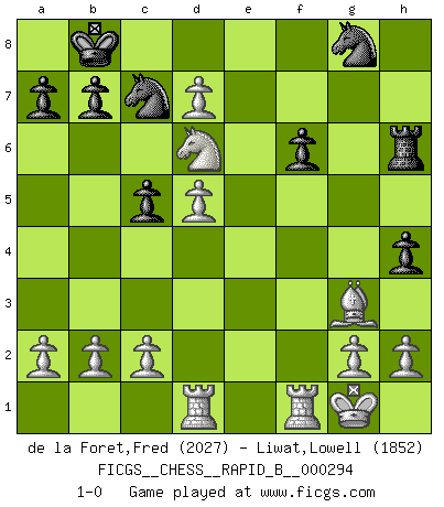Last move : 1-0 2018 October 27 13:31:18 [Event "FICGS__CHESS__RAPID_B__000294"] [Site "FICGS"] [Date "2018.09.04"] [Round "1"] [White "de la Foret,Fred"] [Black "Liwat,Lowell"] [Result "1-0"] [WhiteElo "2027"] [BlackElo "1852"] 1.d4 c5 2.d5 e5 3.e4 d6 4.Nc3 Na6 5.f4 exf4 6.Bxf4 g5 7.Bb5+ Bd7 8.Bxd7+ Qxd7 9.Bxg5 Bg7 10.Nge2 h5 11.O-O f6 12.Bh4 O-O-O 13.Ng3 Qg4 14.Nf5 Rd7 15.Nb5 Bf8 16.Bg3 Qxd1 17.Raxd1 Nc7 18.Nfxd6+ Bxd6 19.Nxd6+ Kb8 20.e5 Rh6 21.e6 h4 22.exd7 1-0 Semi-Benoni (`blockade variation') Kingside Castling by player White (move 11) Queenside Castling by player Black (move 12) Player White won this chess game. Follow this game move after move (download)In order to improve your game, you must study the endgame before everything else, for whereas the endings can be studied and mastered by themselves, the middle game and the opening must be studied in relation to the endgame. (Jose Raul Capablanca) Ich hatte Angst gegen einen russischen Großmeister zu verlieren, und er befürchtete gegen einen kleinen Jungen zu verlieren. (über ein Remis gegen Juri Awerbach). (Robert James Fischer) Bobby Fischer es el jugador de Ajedrez mas grande que jamás haya existido. (Ken Smith) Si le désir cupide (et stupide) de gagner est une inépuisable source de souffrance, une combinaison brillante sur l'échiquier est une découverte : le coquelicot qui s'épanouit lorsque apparaît la Voie Lactée. (Arrabal) There is no vagueness without wind. (Chinese proverb)