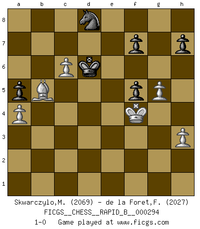 Last move : 1-0 2019 January 6 4:21:50 [Event "FICGS__CHESS__RAPID_B__000294"] [Site "FICGS"] [Date "2018.09.04"] [Round "1"] [White "Skwarczylo,Marek"] [Black "de la Foret,Fred"] [Result "1-0"] [WhiteElo "2069"] [BlackElo "2027"] 1.d4 Nf6 2.Nf3 d5 3.c4 e6 4.Nc3 c6 5.e3 Bd6 6.Qc2 O-O 7.Bd3 b6 8.O-O Bb7 9.b3 Nbd7 10.Bb2 c5 11.cxd5 exd5 12.Nb5 Be7 13.Rfd1 a6 14.Nc3 g6 15.Be2 cxd4 16.Nxd4 Rc8 17.Rac1 b5 18.Qd2 Re8 19.Rc2 Bc5 20.Rdc1 Ne5 21.Bf1 Qe7 22.h3 Ba3 23.Bxa3 Qxa3 24.Nb1 Qf8 25.Qa5 Ne4 26.Nc3 Nc5 27.Nce2 Ned3 28.Rd1 Qe7 29.Nc3 Ne5 30.Qb4 Kg7 31.a4 bxa4 32.Nxa4 Nxa4 33.Qxe7 Rxe7 34.Rxc8 Bxc8 35.bxa4 Nc4 36.Nb3 Be6 37.Nc5 a5 38.e4 Nb2 39.Rb1 Nc4 40.Nxe6+ Rxe6 41.exd5 Rb6 42.Rc1 Nd6 43.Rc6 Rxc6 44.dxc6 Kf6 45.f4 Ke7 46.Kf2 Ne4+ 47.Ke3 Nc5 48.Bb5 Kd6 49.g4 Ne6 50.g5 Nd8 51.f5 gxf5 52.Kf4 1-0 Queen's pawn game Kingside Castling by player Black (move 6) Kingside Castling by player White (move 8) Player White won this chess game. Follow this game move after move (download)It is peculiar but a fact nevertheless, that gamblers in chess always have enthusiastic followers. (Botvinnik) Ich verachte Kasparow. (Viktor Kortschnoi) El Ajedrez es una guerra en un tablero. El objetivo es aplastar la mente del oponente. (Bobby Fischer) Fischer est le meilleur joueur du monde et Karpov n'est qu'un joueur de bistrot. (Garry Kasparov, agé de 16 ans) Are you threatening me, Master Jedi ? (Chancellor Palpatine in Star Wars ep.3)