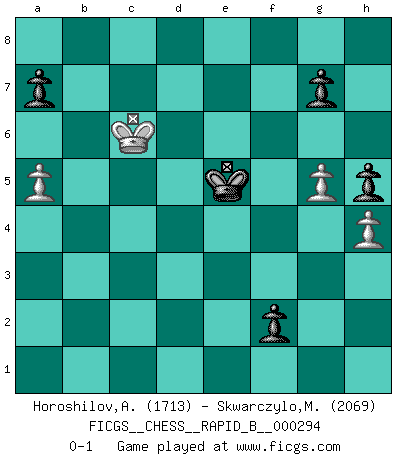 Last move : 0-1 2018 October 25 8:37:8 [Event "FICGS__CHESS__RAPID_B__000294"] [Site "FICGS"] [Date "2018.09.04"] [Round "1"] [White "Horoshilov,Andrey"] [Black "Skwarczylo,Marek"] [Result "0-1"] [WhiteElo "1713"] [BlackElo "2069"] 1.d4 d5 2.Nf3 c6 3.e3 Nf6 4.c4 Bf5 5.Nc3 e6 6.Qb3 Qc7 7.Ne5 Nbd7 8.Nxd7 Qxd7 9.cxd5 exd5 10.Be2 Bd6 11.Bd2 O-O 12.a4 Rfe8 13.f3 Re7 14.O-O-O Rae8 15.g4 Bg6 16.h3 h5 17.g5 Nh7 18.e4 Nf8 19.Rde1 Ne6 20.Be3 Bf4 21.Bxf4 Nxf4 22.Bf1 Ne6 23.h4 Nxd4 24.Qd1 dxe4 25.fxe4 Qd6 26.Bd3 Qb4 27.Na2 Qc5+ 28.Nc3 Bxe4 29.Bxe4 Rxe4 30.Kb1 Rxe1 31.Rxe1 Qf5+ 32.Ka2 Rxe1 33.Qxe1 Qe6+ 34.Qxe6 Nxe6 35.Ne2 Kh7 36.Ng3 Kg6 37.Kb3 Nd4+ 38.Kc4 Nf5 39.Nxf5 Kxf5 40.Kc5 Ke5 41.b4 f5 42.b5 f4 43.bxc6 bxc6 44.Kxc6 f3 45.a5 f2 0-1 Queen's pawn game Kingside Castling by player Black (move 11) Queenside Castling by player White (move 14) 10 pieces endgame at move 43 : White KPPP , Black KPPPPP WHITE : King + 3 Pawns BLACK : King + 5 Pawns 9 pieces endgame at move 44 : White KPPP , Black KPPPP WHITE : King + 3 Pawns BLACK : King + 4 Pawns Player Black won this chess game. Follow this game move after move (download)Mistrust is the most necessary characteristic of the Chess player. (Siegbert Tarrasch) Der Umstand, daß uns eine 7 Stunden Zeitkontrolle ermöglicht eine großartige, tiefe Partie zu spielen, ist für die Massenmedien nicht weiter von Bedeutung. (Alexej Shirov) Un jugador que es sorprendido, esta derrotado a medias. (Proverbio) Vous n'êtes pas toujours obligé de jouer le meilleur coup. Un coup doit être actif, entreprenant, correct et beau ! (David Bronstein) Philosophers use a language that is already deformed as though by shoes that are too tight. (Ludwig Wittgenstein)