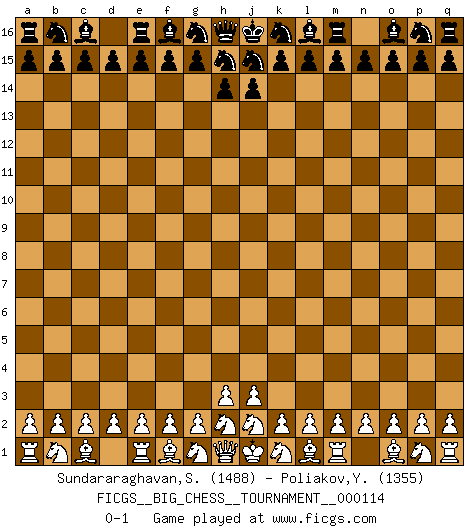 Last move : 0-1 2018 October 5 18:55:6 [Event "FICGS__BIG_CHESS__TOURNAMENT__000114"] [Site "FICGS"] [Date "2018.09.05"] [Round "1"] [White "Sundararaghavan,Shailesh"] [Black "Poliakov,Youri"] [Result "0-1"] [WhiteElo "1488"] [BlackElo "1355"] 0-1 This big chess game has been lost on time (started : 2018.09.05 15:2:4) Follow this game move after move (download)With or without the title, Bobby Fischer was unquestionably the greatest player of his time. (Burt Hochberg) Ich kenne Menschen, die allen Willen der Welt besitzen und doch nicht Schach spielen können. (Robert James Fischer) El jugador de combinación piensa hacia adelante; comienza de la posición dada y trabaja las movidas contundentes en su mente. (Emanuel Lasker) Karpov est une pièce de musée. (Garry Kasparov) Those who make the worst use of their time are the first to complain of its brevity. (Jean de la Bruyere)