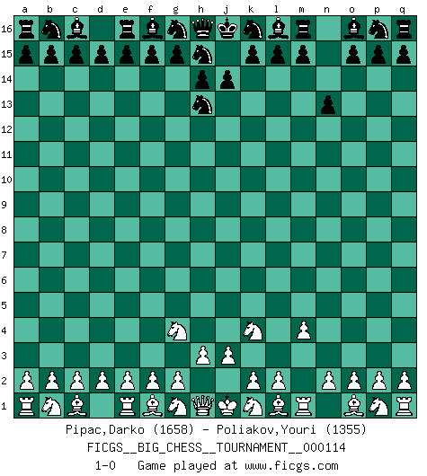 Last move : 1-0 2018 September 9 16:23:41 [Event "FICGS__BIG_CHESS__TOURNAMENT__000114"] [Site "FICGS"] [Date "2018.09.05"] [Round "1"] [White "Pipac,Darko"] [Black "Poliakov,Youri"] [Result "1-0"] [WhiteElo "1658"] [BlackElo "1355"] 1.j2-k4 j15-h13 2.h2-g4 n15-n13 3.m2-m4 1-0 Follow this game move after move (download)I don't believe in psychology. I believe in good moves. (Bobby Fischer) Wenn Schach ein enormer Dschungel ist, der seine Myriaden von Geheimnissen nicht preisgeben will, dann sind Computer die Kettensägen einer gewaltigen ökologisch unsensiblen Nutzholzfirma. (Nigel Short) El Ajedrez era la lengua materna de Capablanca. (Reti) Donnez-moi un Cavalier en 6e et je gagnerais toutes mes parties. (Steinitz) Hold em is to stud what chess is to checkers. (Johnny Moss)