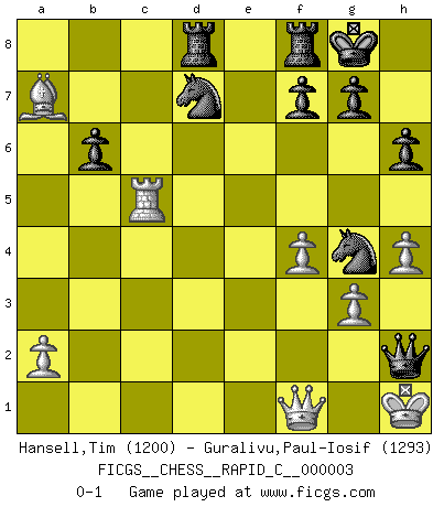 Last move : 0-1 2006 July 10 15:21:50 [Event "FICGS__CHESS__RAPID_C__000003"] [Site "FICGS"] [Date "2006.06.08"] [Round "1"] [White "Hansell,Tim"] [Black "Guralivu,Paul-Iosif"] [Result "0-1"] [WhiteElo "1200"] [BlackElo "1293"] 1.e4 c5 2.Nf3 Nc6 3.Nc3 e5 4.Be2 Nf6 5.Bc4 h6 6.Nxe5 Nxe5 7.Nd5 Nxc4 8.Nc7+ Qxc7 9.d3 Nb6 10.f4 d5 11.exd5 Nbxd5 12.Qe2+ Be7 13.O-O O-O 14.c4 Nb6 15.Be3 Bf5 16.d4 Rad8 17.dxc5 Bd3 18.Qf2 Bxf1 19.Qxf1 Nbd7 20.c6 Qxc6 21.Bxa7 b6 22.Rc1 Bc5+ 23.Kh1 Qd6 24.b4 Bxb4 25.c5 Bxc5 26.h4 Ng4 27.g3 Qd2 28.Rxc5 Qh2+ 0-1 Sicilian defense Kingside Castling by player White (move 13) Kingside Castling by player Black (move 13) Player Black won this chess game. Follow this game move after move (download)All that matters on the Chessboard is good moves. (Bobby Fischer) Im Blitz ist es einfacher mit einer Figur weniger anzugreifen, als sich mit einer Mehrfigur zu verteidigen. (Mikhail Nekhemyevich Tal) Un jugador que trata de regresar una movida en el Ajedrez es un futuro carterista. (Richard Fenton) C'est une question de caractère, Beaucoup de gens perdent leur motivation très vite. D'autres, ils sont rares, peuvent la conserver très longtemps. J'aime les échecs, encore aujourd'hui je suis heureux d'analyser des parties. J'aime toujours gagner, je déteste encore perdre. Bien jouer est important pour mon intégrité intellectuelle et morale. Et puis les échecs vivent en ce moment une période historique grâce à Internet. Ils se développent dans les systèmes éducatifs à travers le monde. Ils sortent de leur ghetto, et c'est mon rôle de mener à bien cette révolution. (Gary Kasparov) A good player is always lucky. (Capablanca)