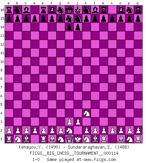 Last move : 1-0 2018 October 10 7:26:11 [Event "FICGS__BIG_CHESS__TOURNAMENT__000114"] [Site "FICGS"] [Date "2018.09.05"] [Round "1"] [White "Kehayov,Yulian"] [Black "Sundararaghavan,Shailesh"] [Result "1-0"] [WhiteElo "1490"] [BlackElo "1488"] 1.j2-k4 1-0 This big chess game has been lost on time (started : 2018.09.05 15:2:4) Follow this game move after move (download)Becoming successful at Chess allows you to discover your own personality. That's what I want for the kids I teach. (Saudin Robovic) Kleine Schachspieler machen Mist, und große Schachspieler machen Mist, aber große machen weniger Mist. (Fritz Sämisch) Una clavada es mas poderosa que una espada. (Fred Reinfeld) Il vaut toujours mieux jouer un plan faux de façon logique que de n'avoir pas de plan du tout. (Victor Kortchnoï) The hypothalamus is one of the most important parts of the brain, involved in many kinds of motivation, among other functions. The hypothalamus controls the 'Four Fs: Fighting, Fleeing, Feeding and Mating. (Unknown author)