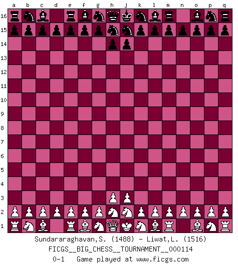Last move : 0-1 2018 October 5 18:55:6 [Event "FICGS__BIG_CHESS__TOURNAMENT__000114"] [Site "FICGS"] [Date "2018.09.05"] [Round "1"] [White "Sundararaghavan,Shailesh"] [Black "Liwat,Lowell"] [Result "0-1"] [WhiteElo "1488"] [BlackElo "1516"] 0-1 This big chess game has been lost on time (started : 2018.09.05 15:2:4) Follow this game move after move (download)As one by one I mowed them down, my superiority soon became apparent. (Jose Capablanca) Ein Buch ist ein Spiegel; wenn ein Affe hineinsieht, so kann kein Apostel heraus gucken. (Georg Christoph Lichtenberg) Un Peón pasado aumenta su poder a medida de que el número de piezas en el tablero disminuye. (Capablanca) Comme les marins qui ont mille raisons différentes d'aller en mer, les joueurs d'échecs en ont tout autant avant de s'installer devant une table et jouer... (Vincent Bertignac, philosophe) Difficult things take a long time, impossible things a little longer. (Author unknown)